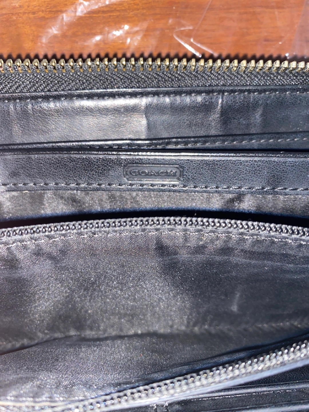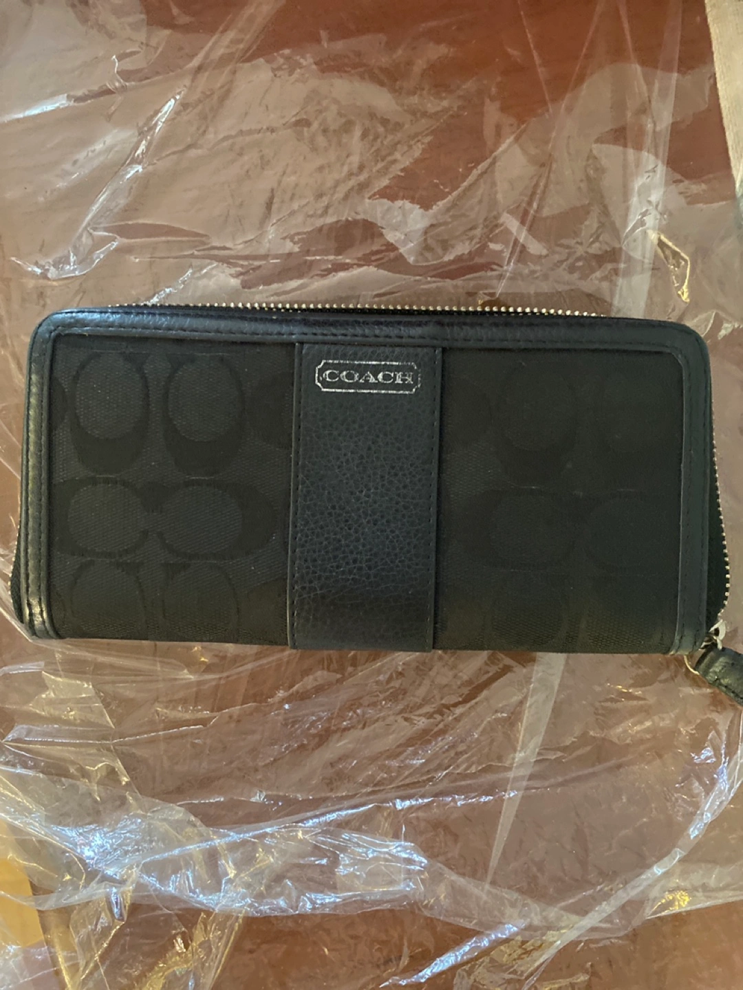 Black Coach zip around wallet. Has multiple card slots and pockets. Features Coach signature C pattern on the front.