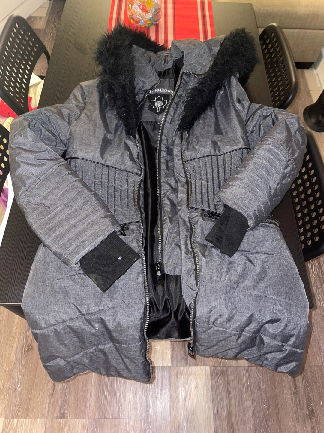 Grey winter jacket with a faux fur hood. Has a zipper closure and multiple pockets. It didn’t fit it need to go AS is
