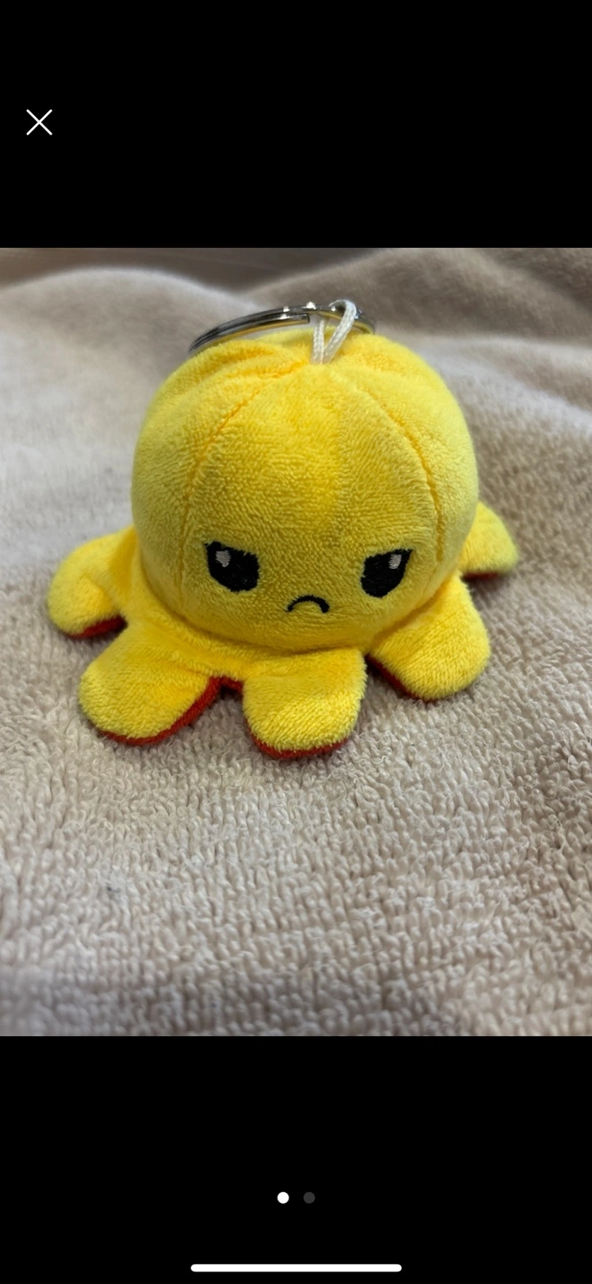 Two small plush octopus toys. One yellow with a frowning face and the other red with a smiling face. Both reversible and have a keychain ring. #freecycle