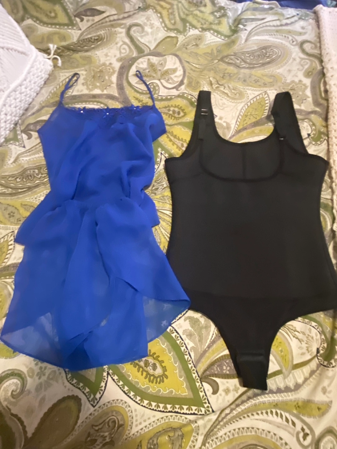 Blue and black lingerie set. The top is a sheer, blue, spaghetti strap camisole. The bottom is a black, body-shaping bodysuit with adjustable straps. $5 for all