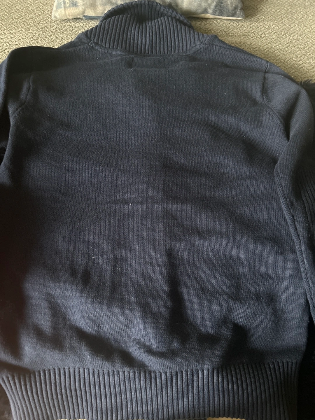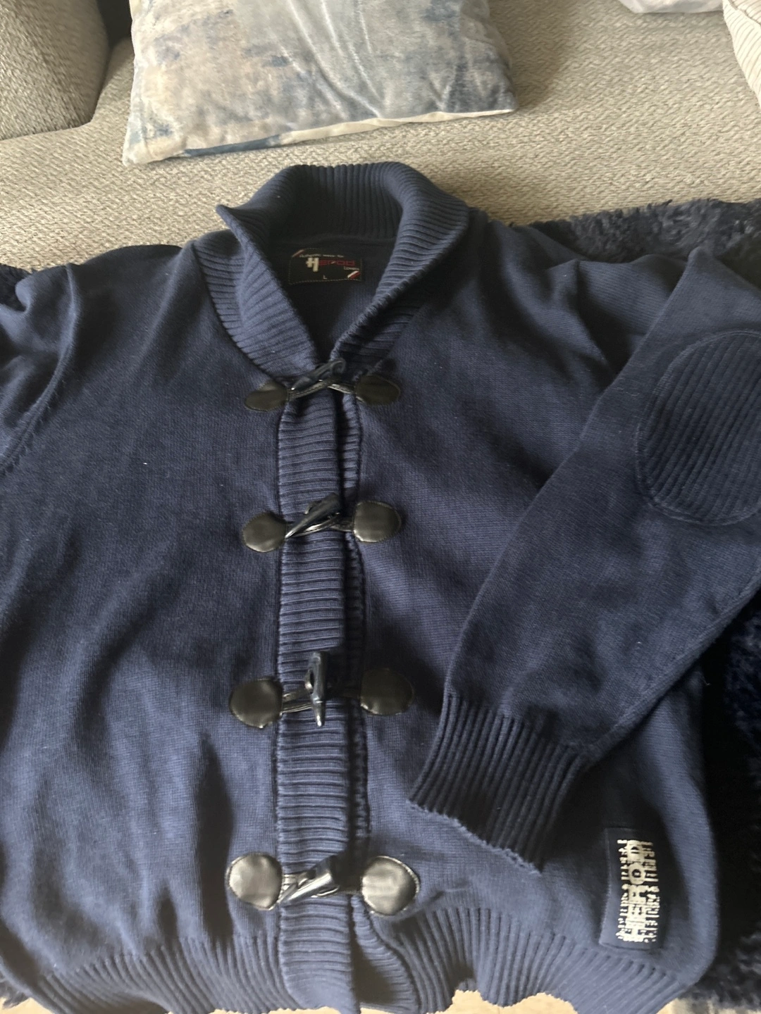 Long sleeve navy blue cardigan. Features a high collar and button closures. Made of a soft knitted fabric.