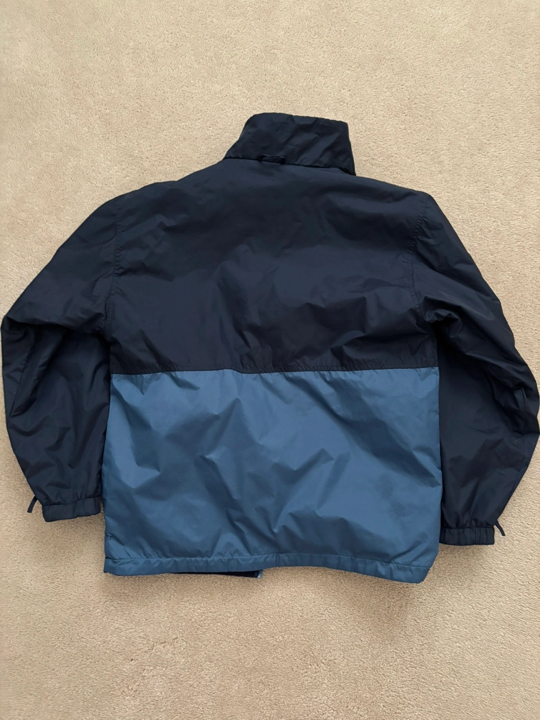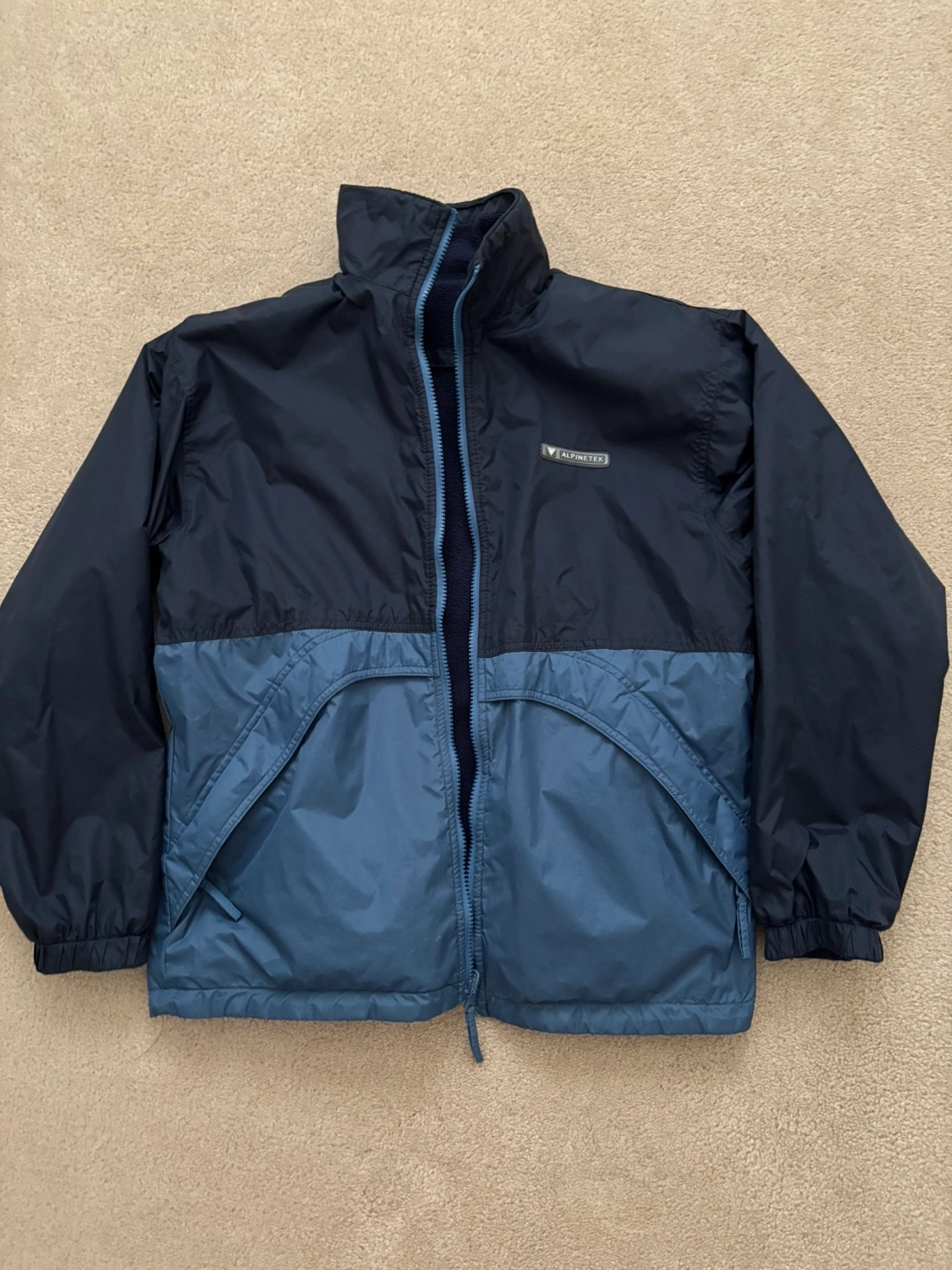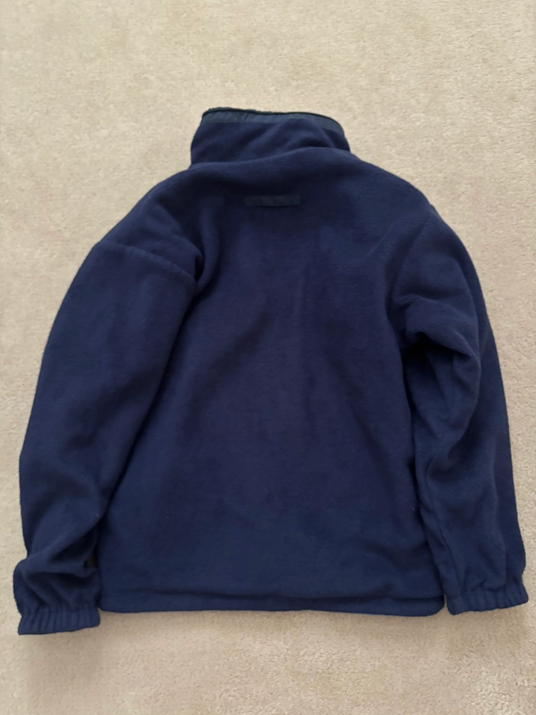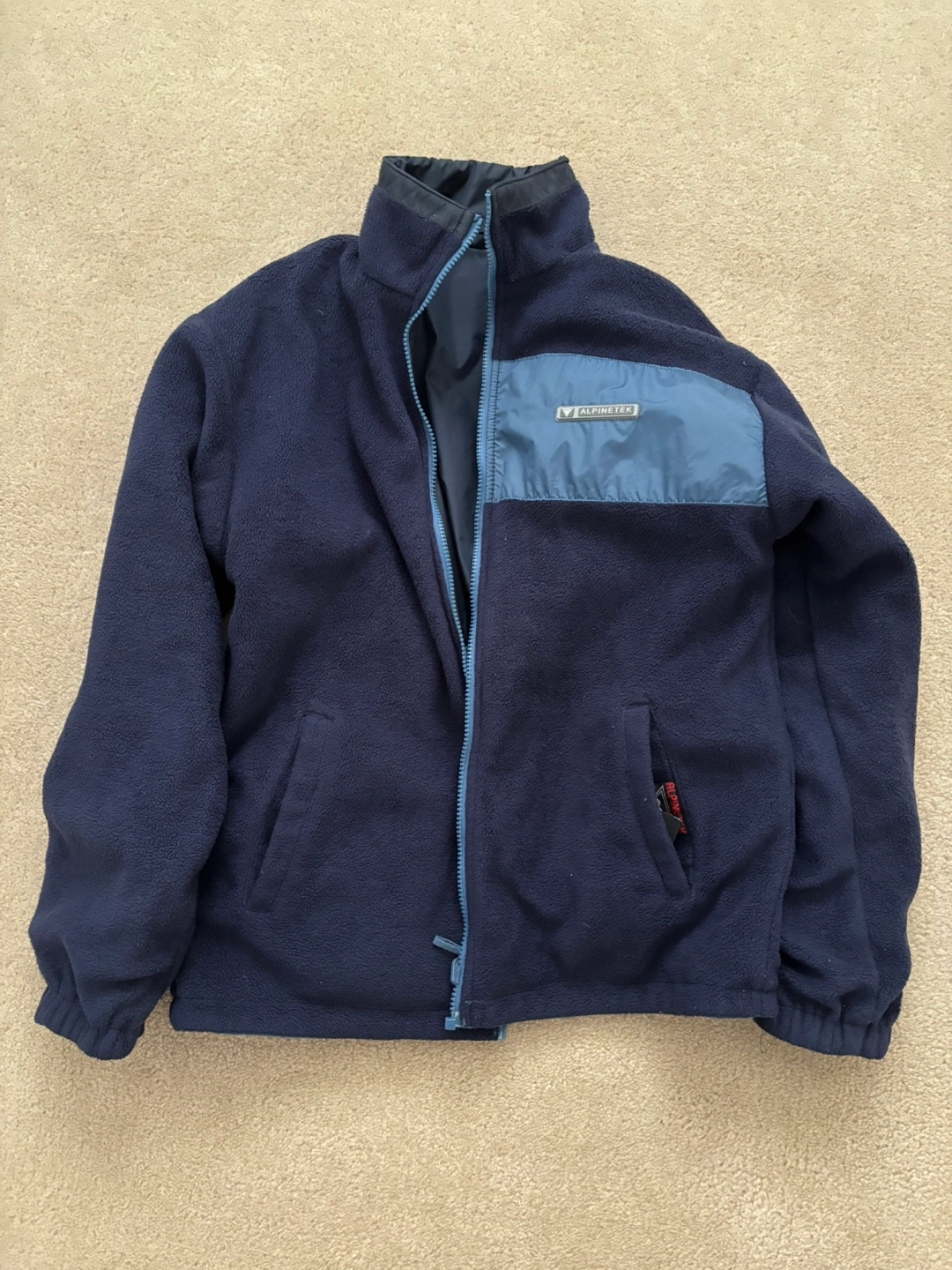 Blue fleece jacket with a zip up front. Features a dark blue fleece on one side and a dark blue and light blue nylon on the other. Size 14/16 L (i think a youth large, fits like a junior/women’s XS)