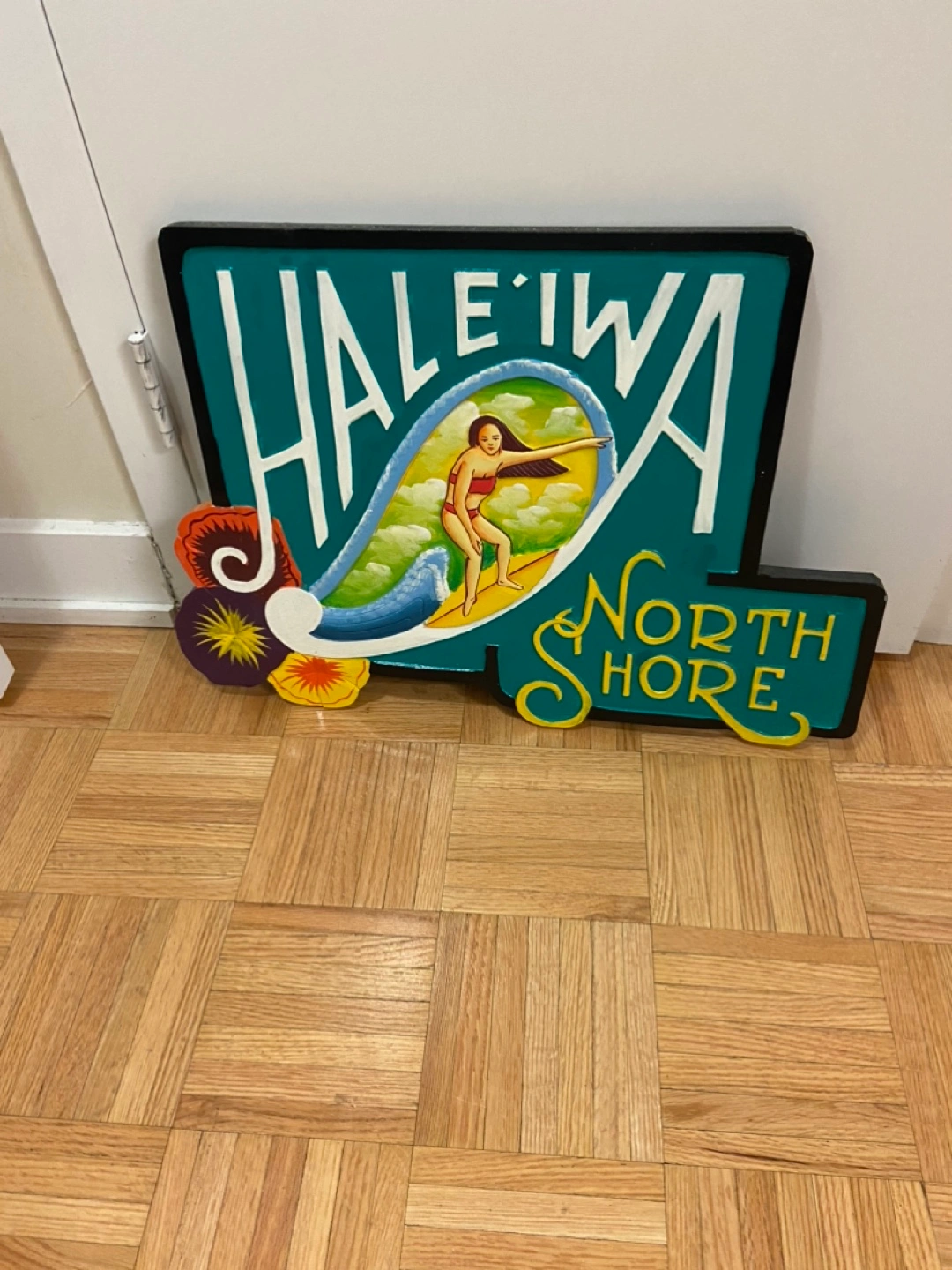 1000+Wooden sign with a woman surfing and the words Haleiwa North Shore. Bought in Oahu, Hawaii for $100 USD.