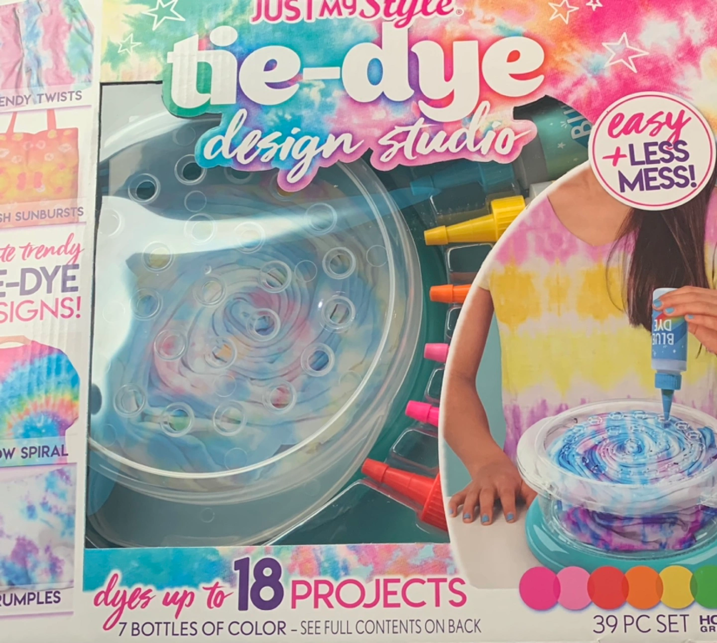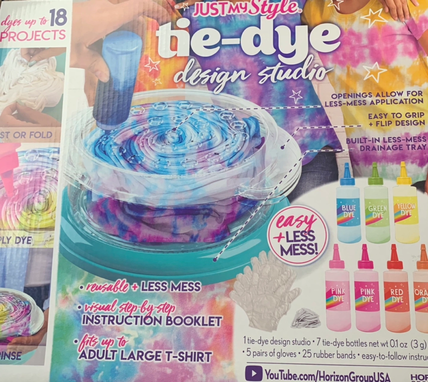 Tie-dye design studio kit. Includes 7 bottles of dye, 1 tie-dye design studio, 5 pairs of gloves, 25 rubber bands and an instruction booklet. Dyes up to 18 projects. Fits up to adult large T-shirt.