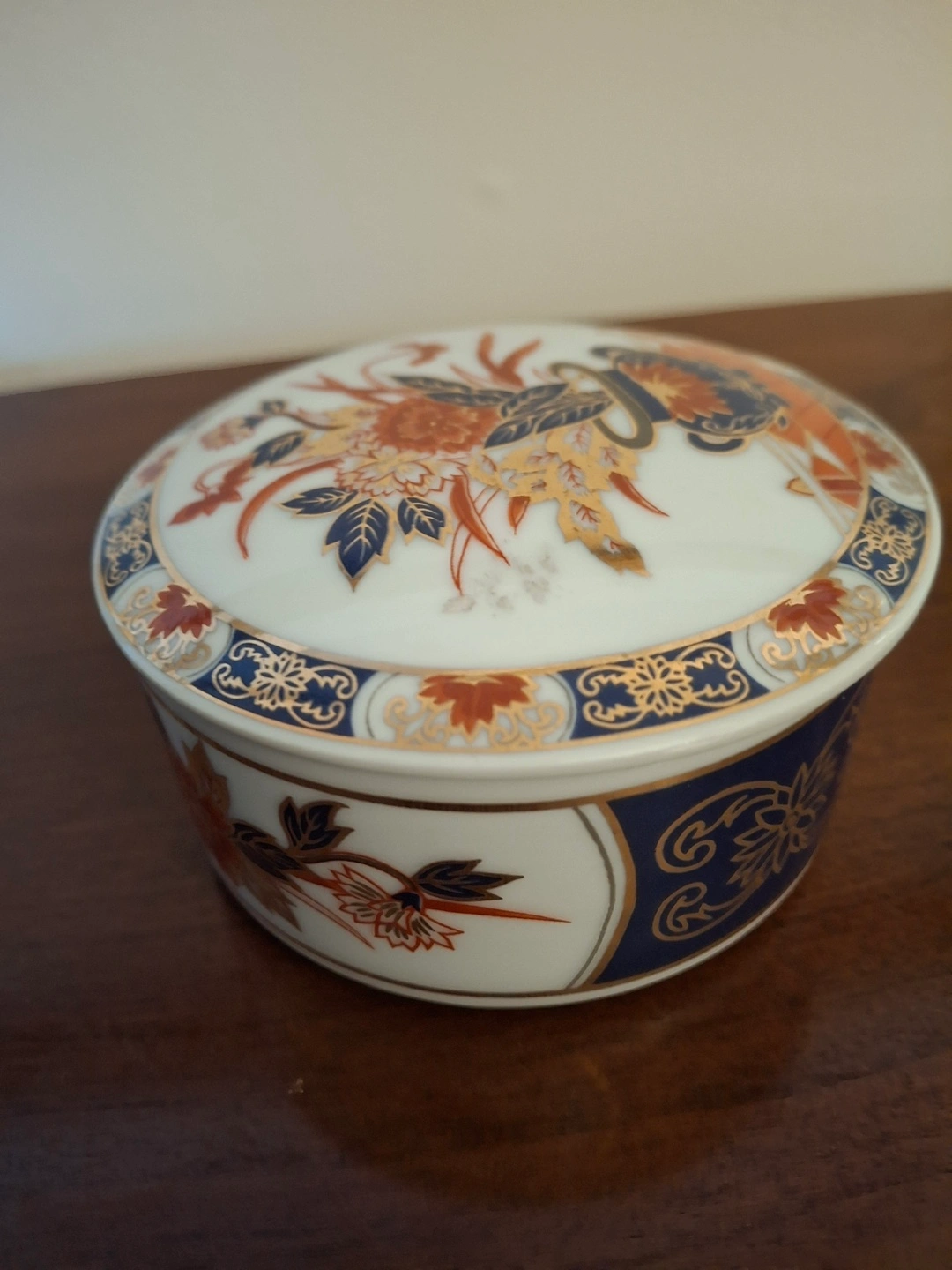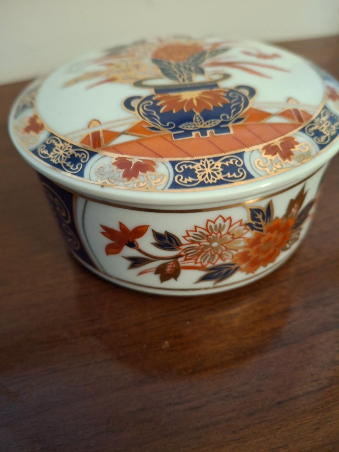 Small porcelain trinket jar with lid. Beautifully decorated in gold, dark blue, and rust tones. Made by The Orient Inc. 3.5” across and 1.75”’ high. Never been used.