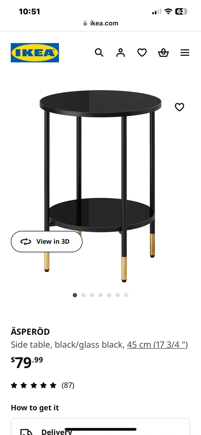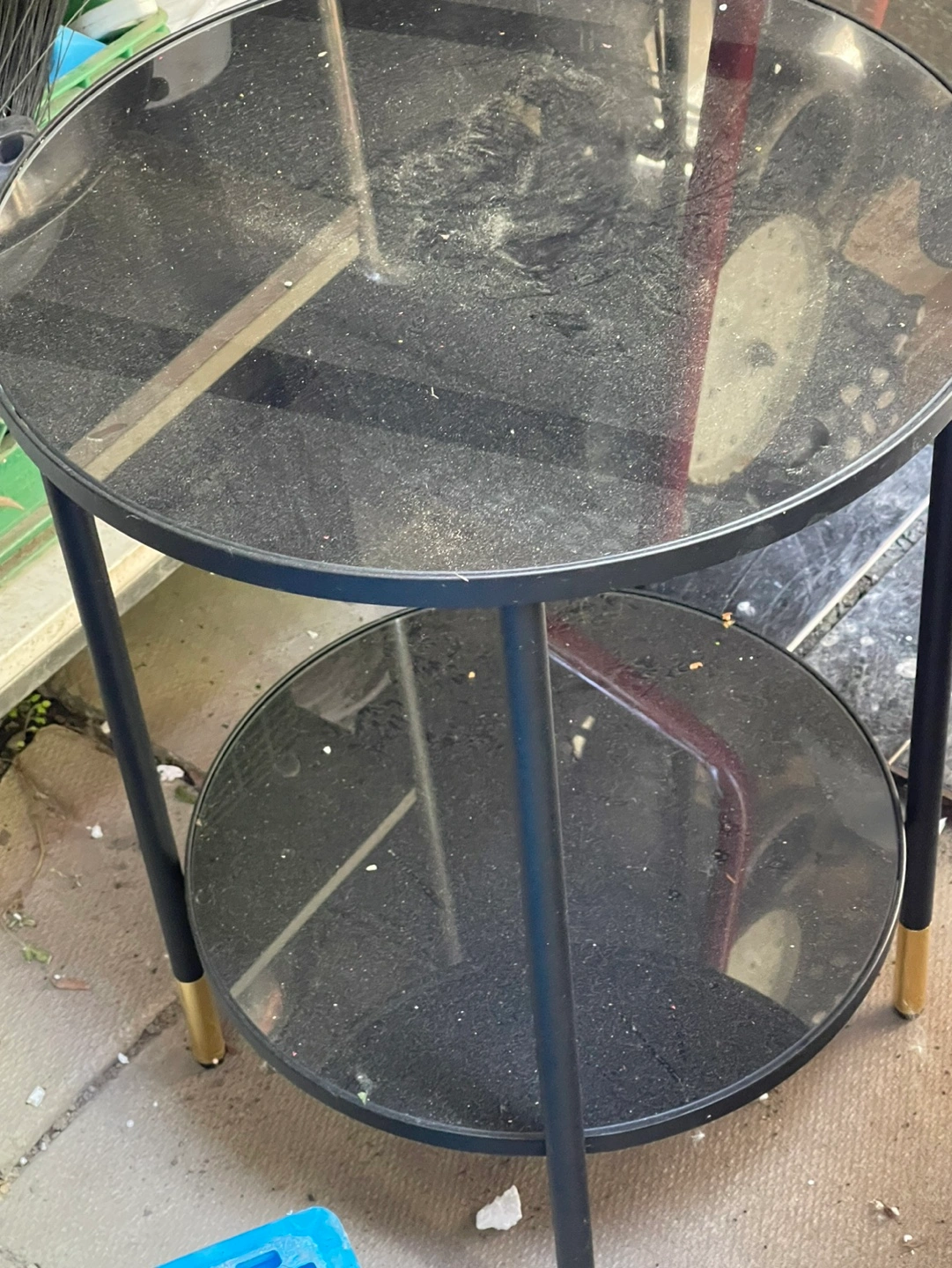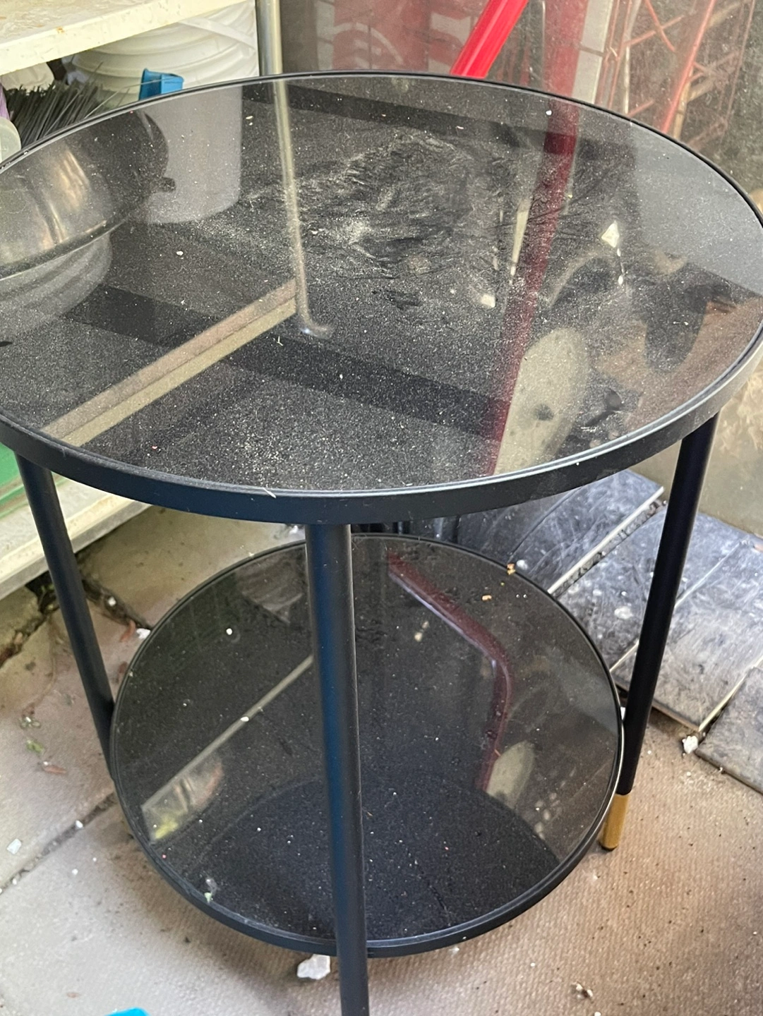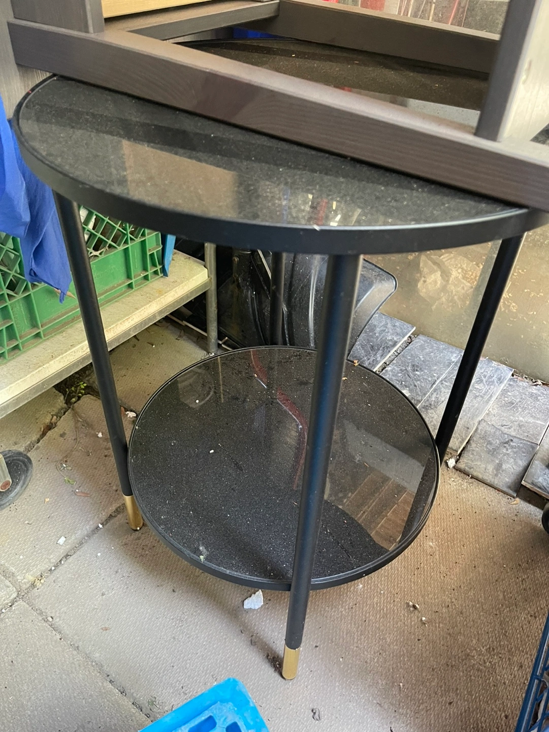 Black glass top and bottom shelf. Black metal frame with gold accents. Great condition. Like new. Need gone by weekend. Please check photos for dimensions. Price is firm at $40. Pick up downtown, Toronto.