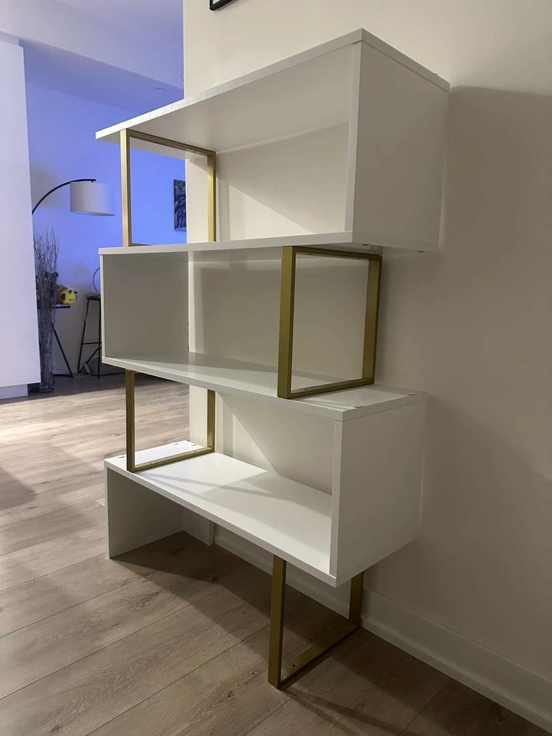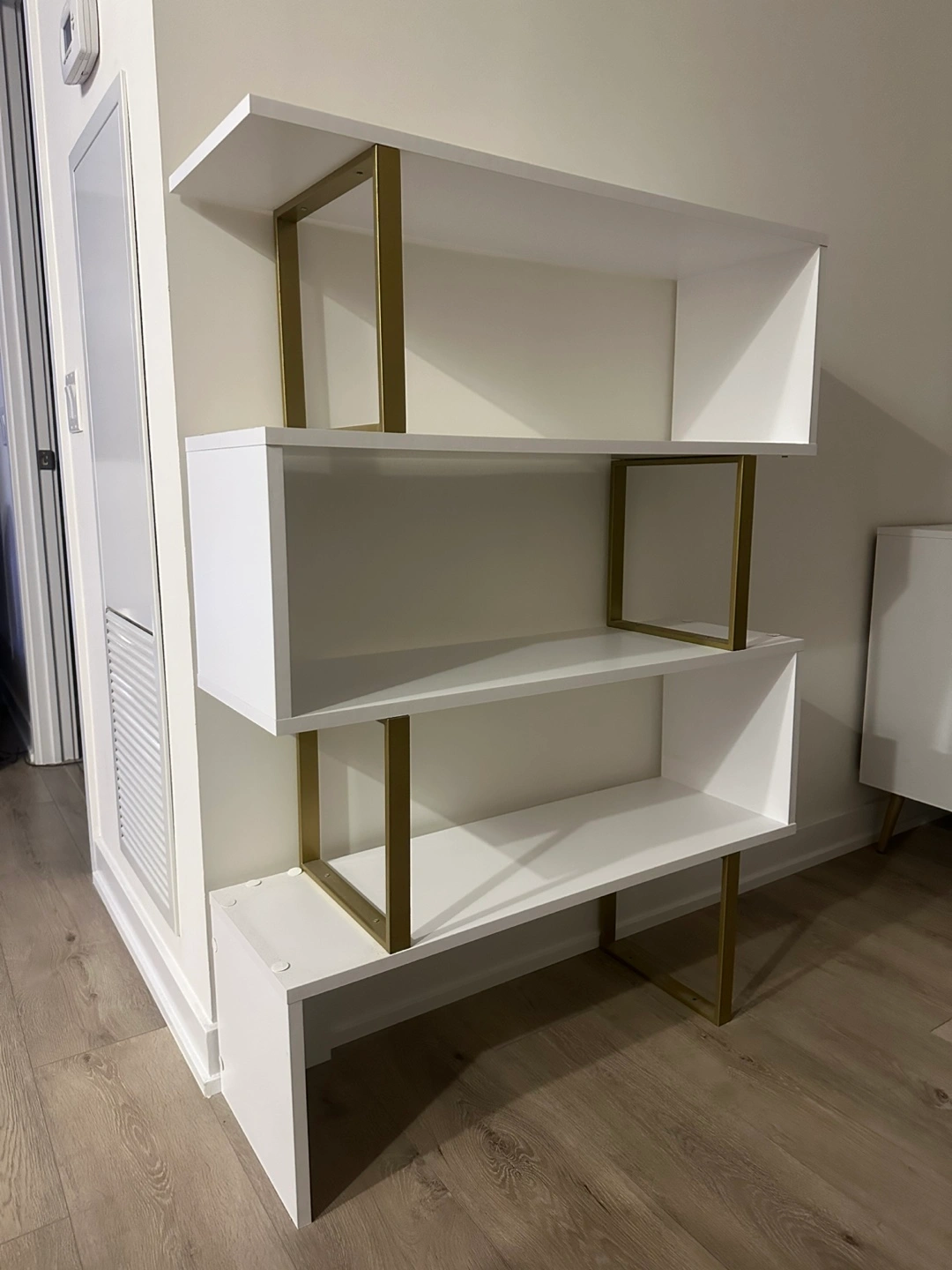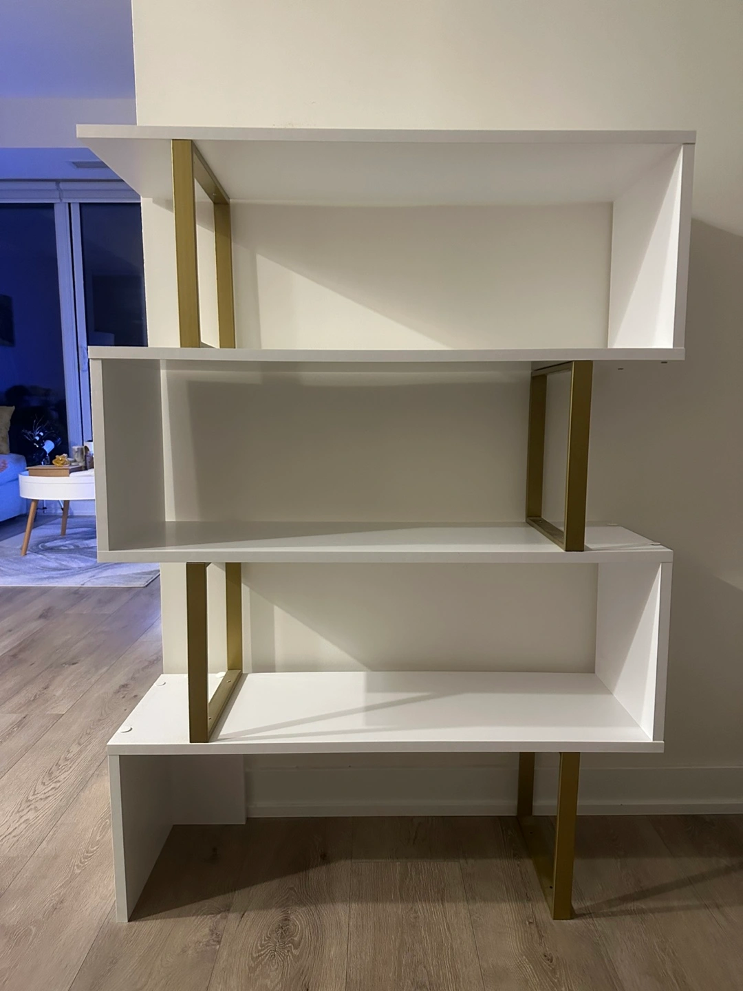 Bought from Wayfair in Dec 2022. Malveaux Geometric Bookcase (Gold / White) White bookshelf with gold metal accents. Has 5 layers in total. In good condition. Dimensions are in the last picture. More details - https://www.wayfair.ca/furniture/pdp/wrought-studio-malveaux-49-h-x-35-w-geometric-bookcase-c000895604.html Current Retail Price - $419.99 (Pre-Tax) Open to offers! Only available for pickup at Downtown Toronto (Harbourfront)