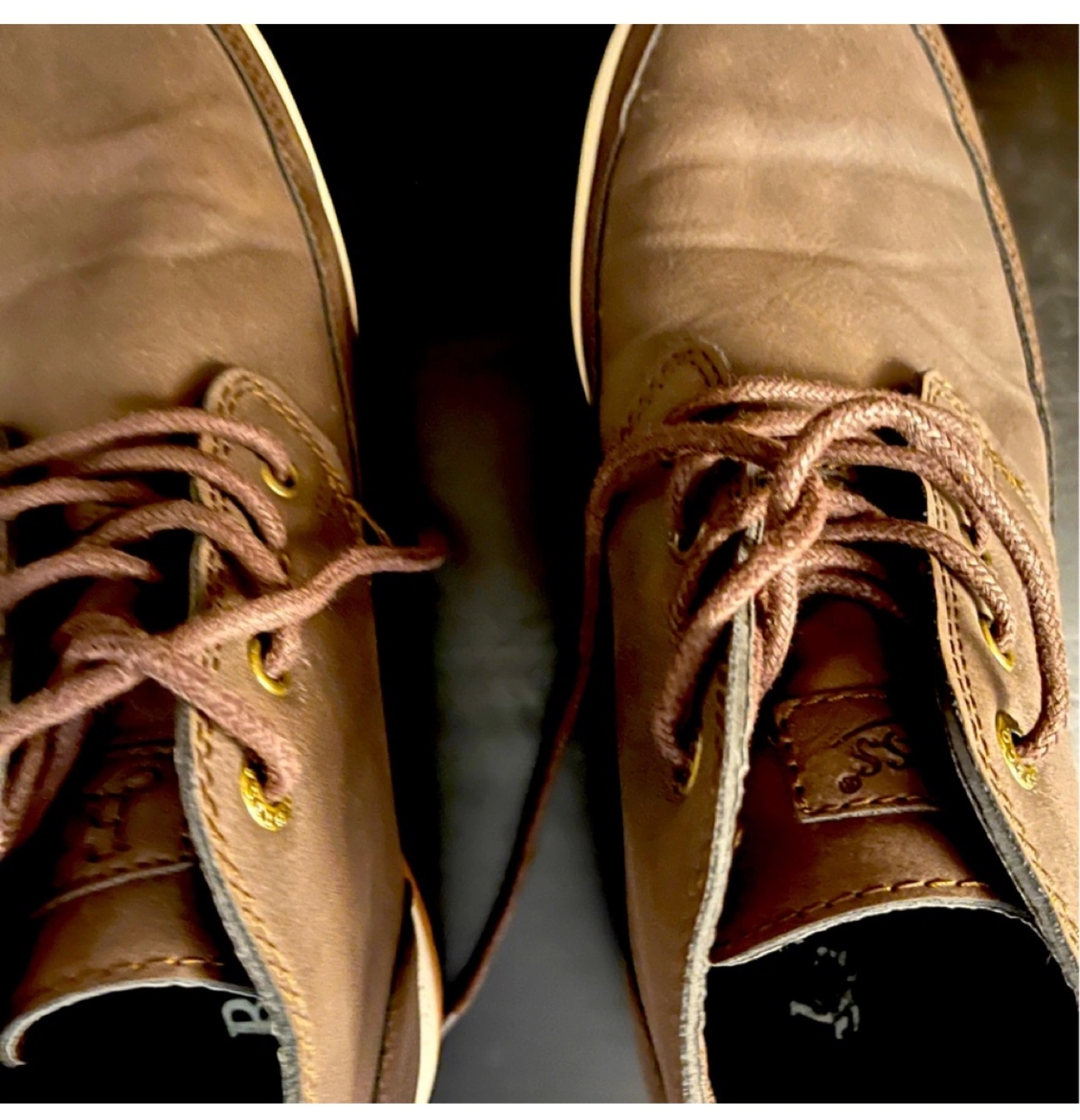 Men Brown leather boots with laces. They have a white sole with a brown outer rim. Show worn once only.