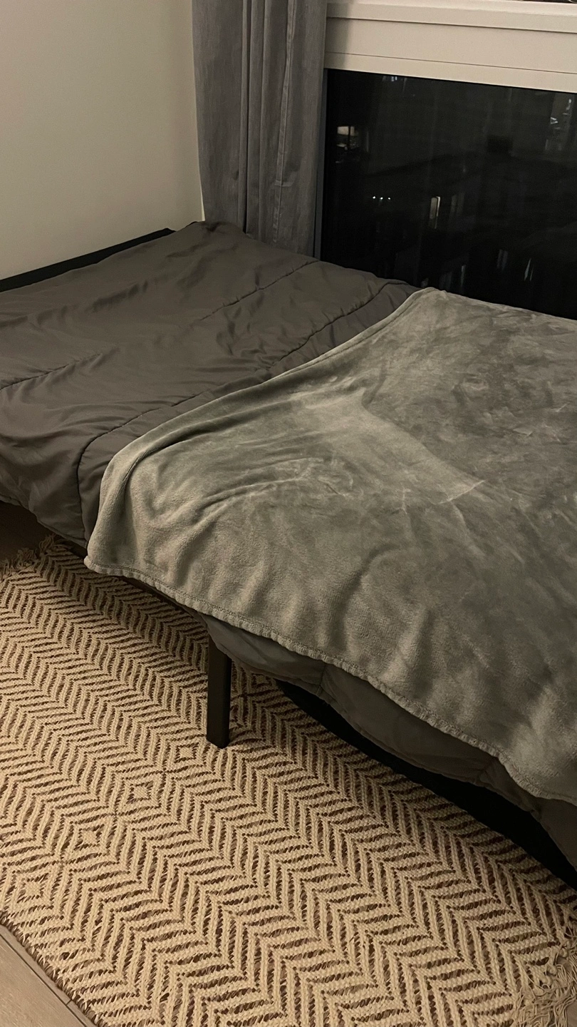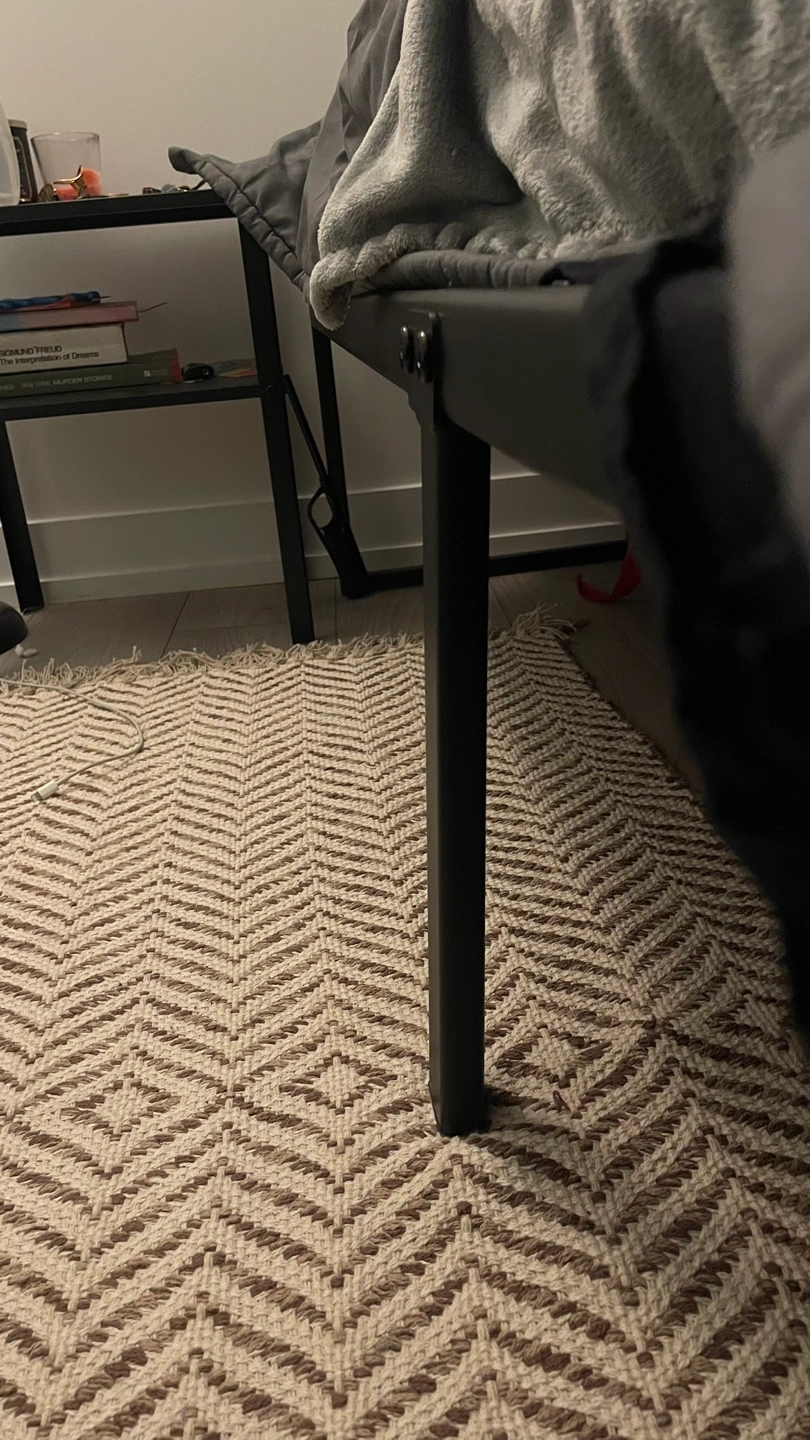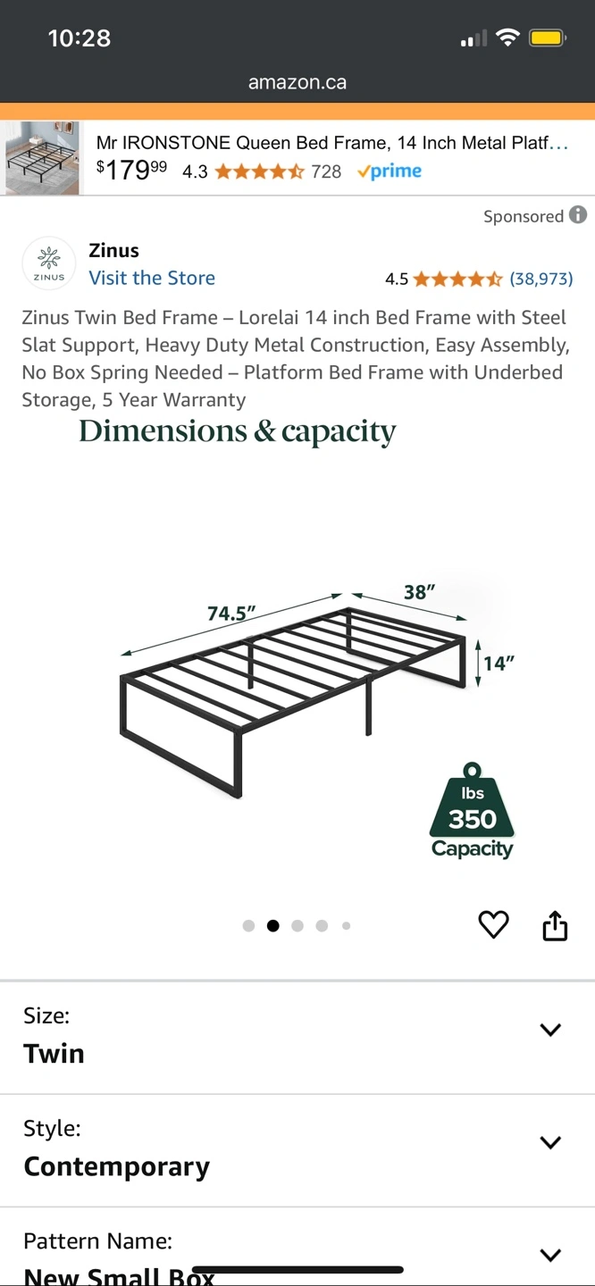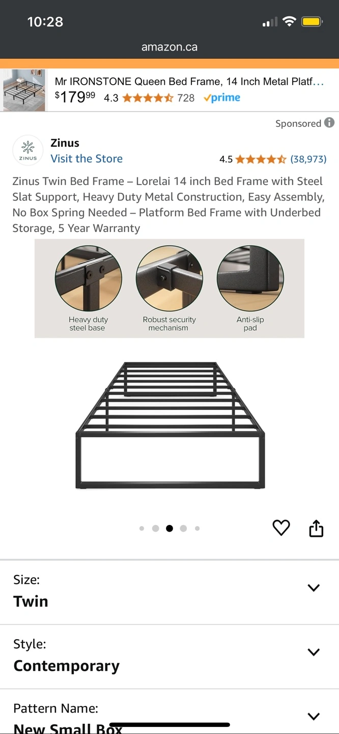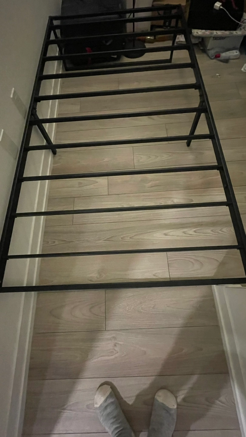 Twin bed frame with steel slat support. Heavy duty metal construction. Easy assembly. No box spring needed. Platform bed frame with underbed storage.