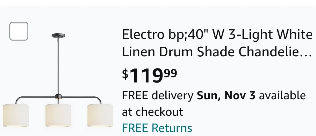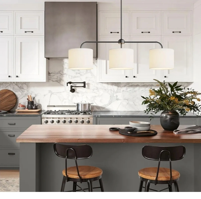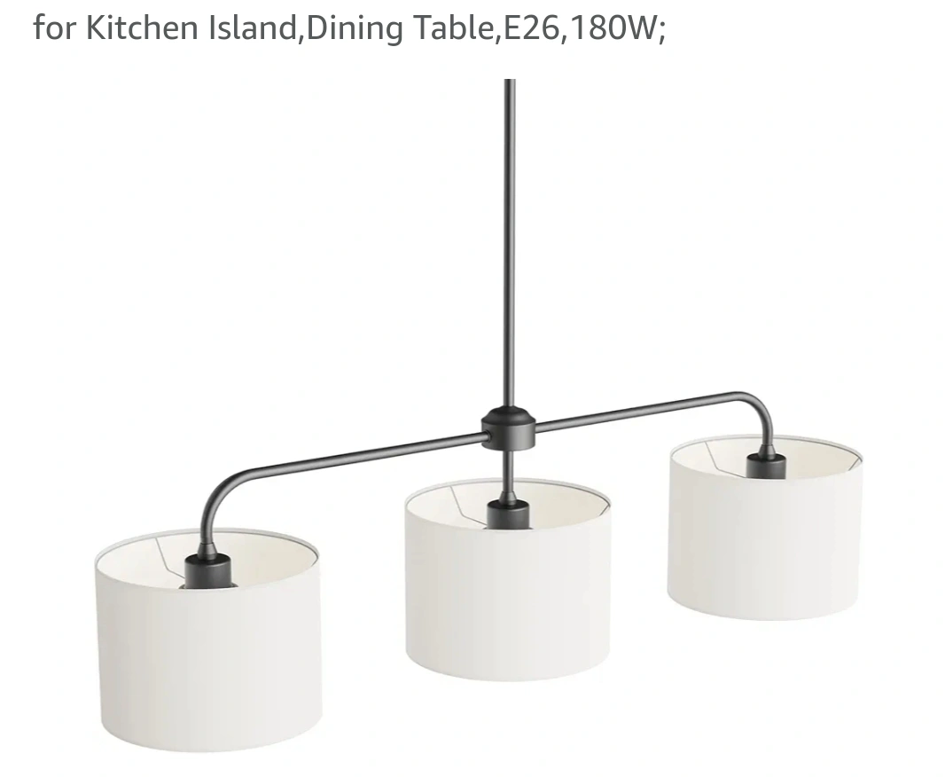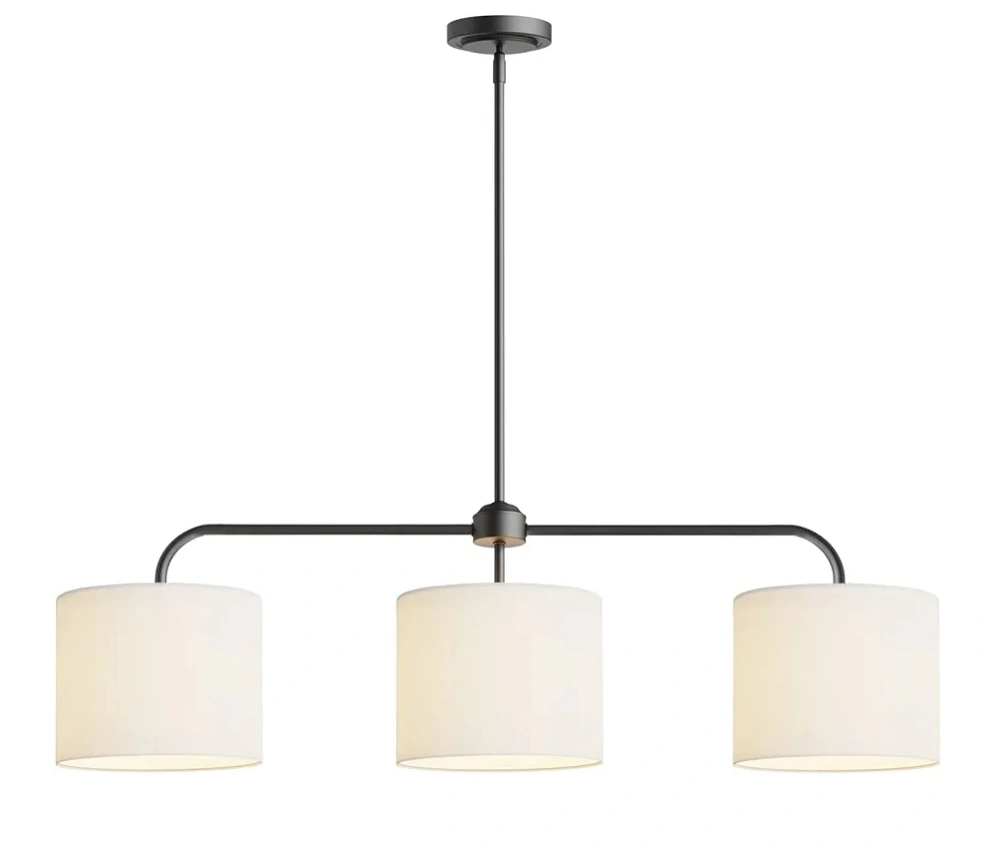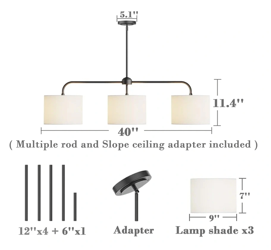 2023-light chandelier with white drum shades. 40" wide. Includes slope ceiling adapter and multiple rod lengths.