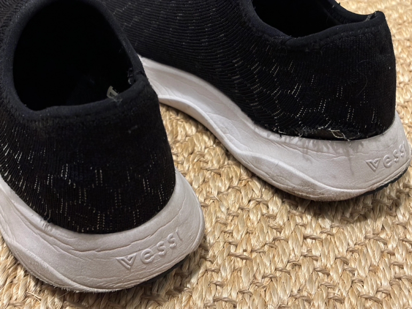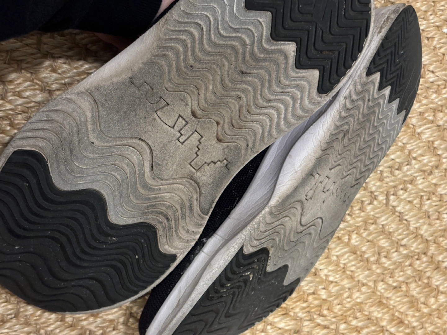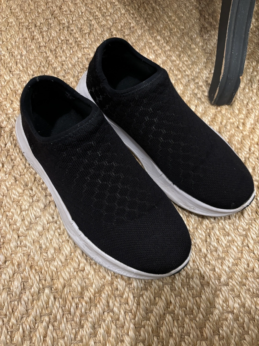 687Pick up at Dundas and River Black slip-on sneakers with a white sole. PLEASE NOTE: no longer waterproof Some worn/ fraying parts. Refer to pictures for condition.
