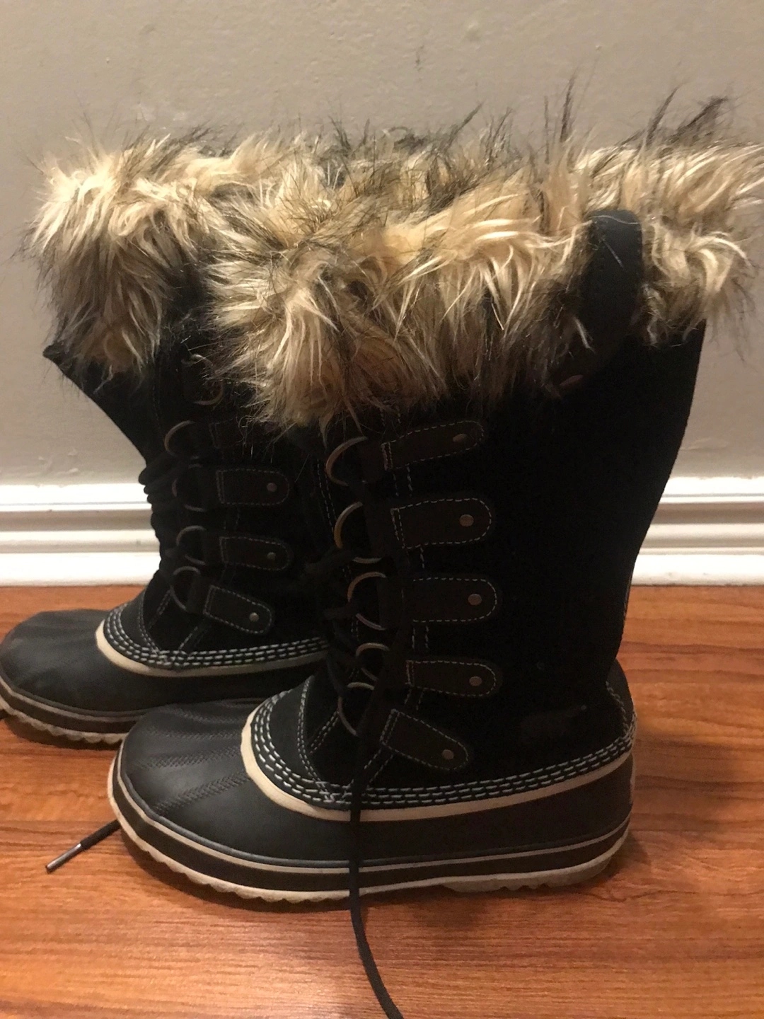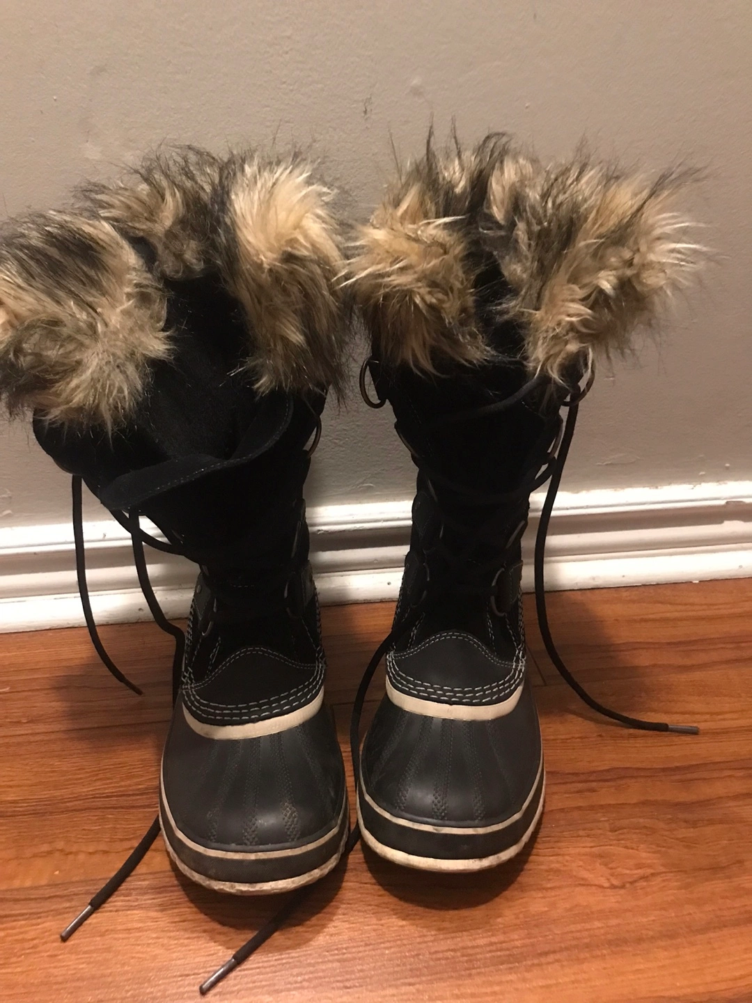 Black winter boots with fur trim, lace-up closure. Size 9 US women's. Pick up Hillcrest Avenue Mississauga