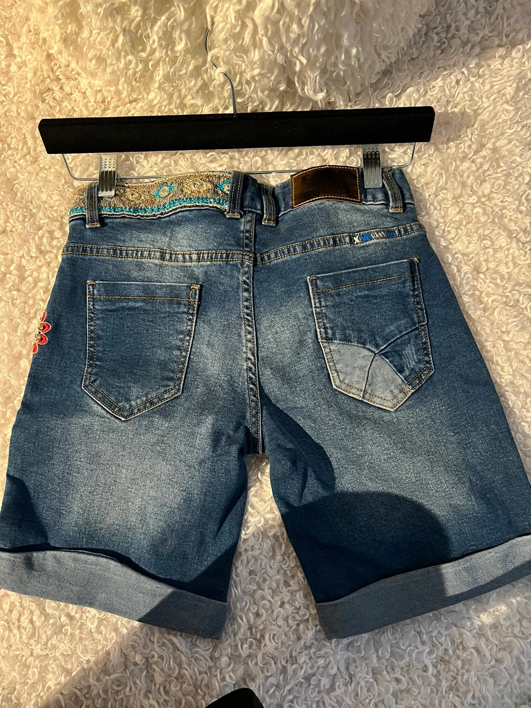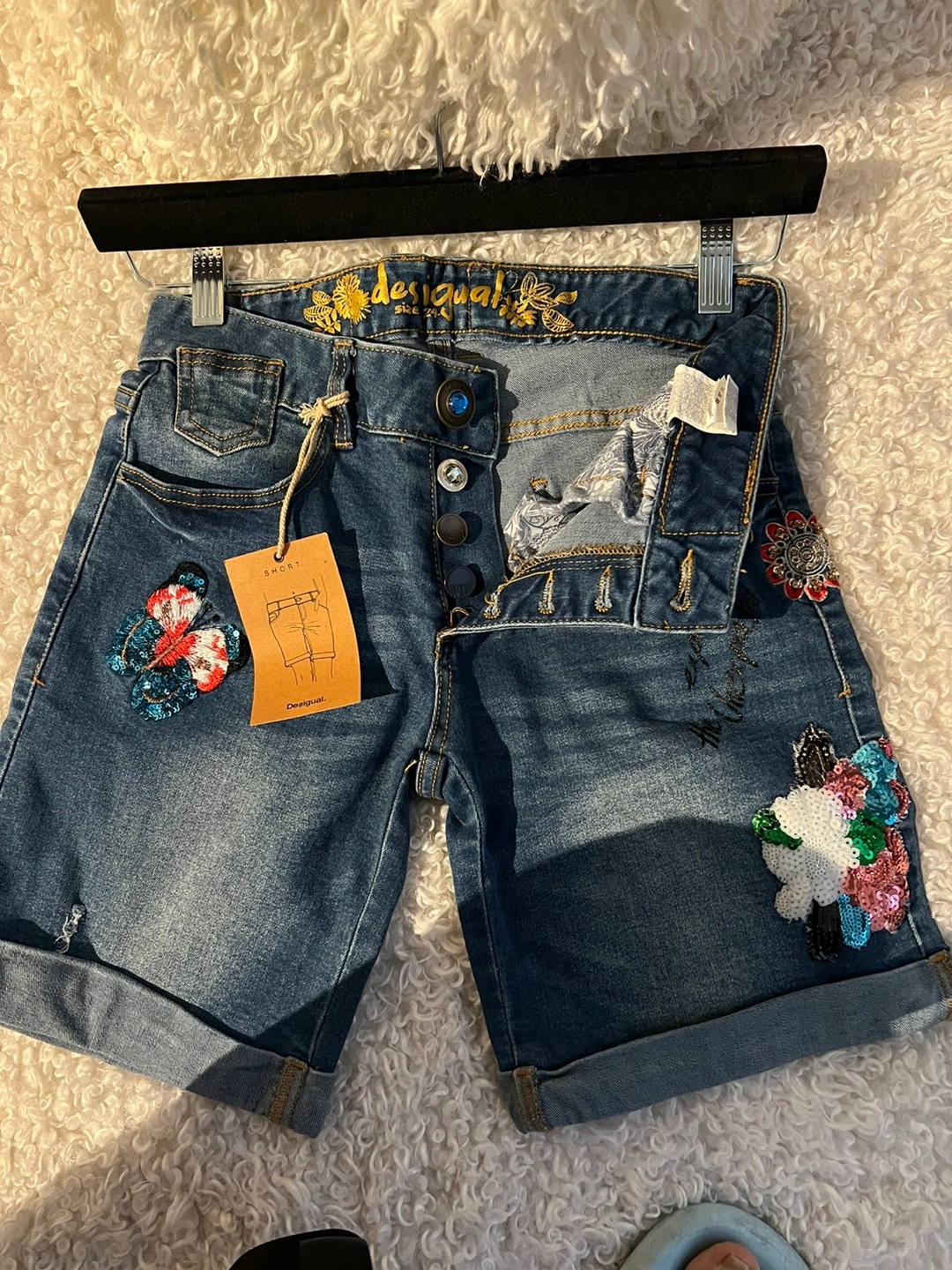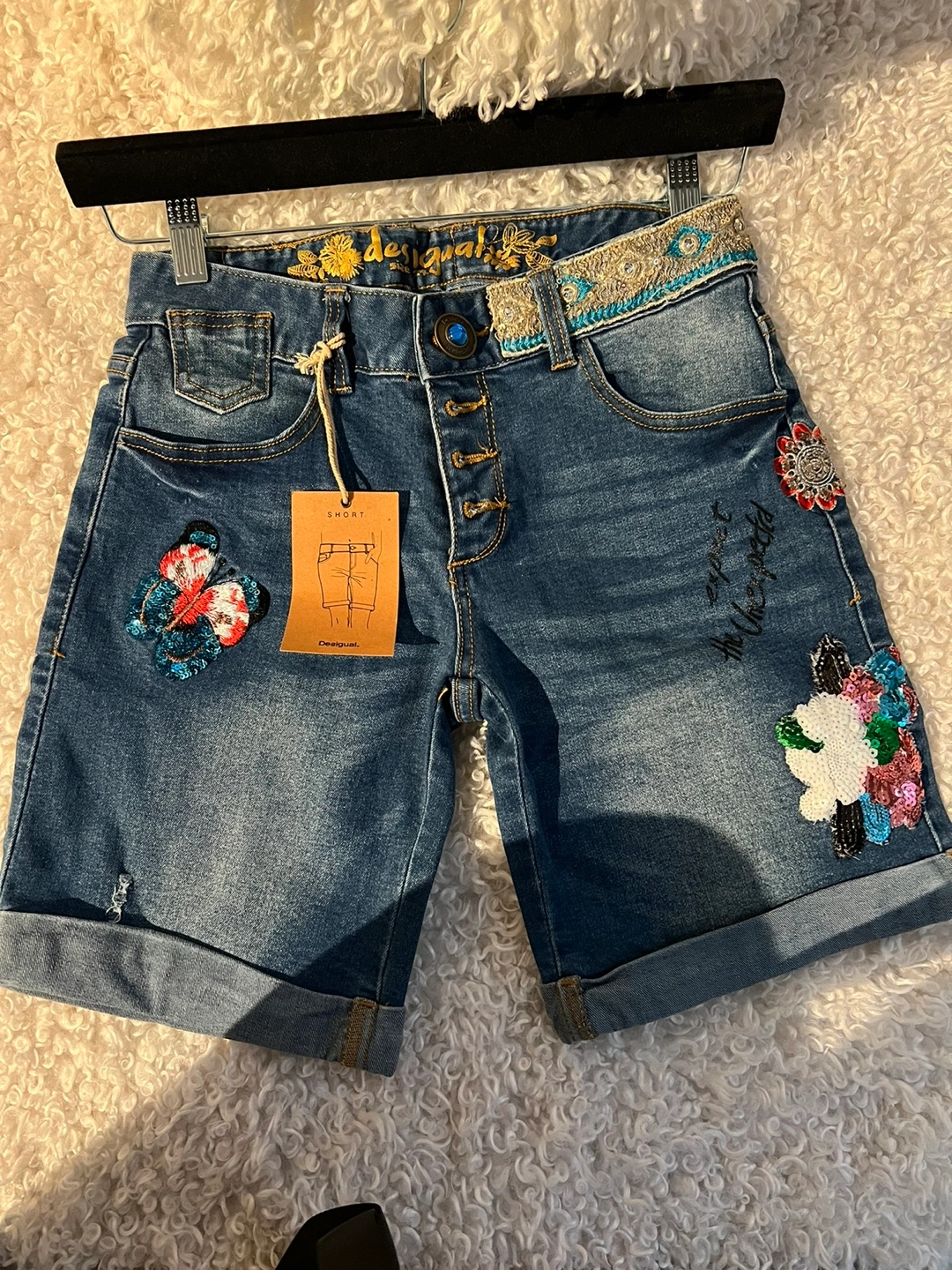 Blue denim shorts with embroidered flowers and butterflies. Rolled up hems. Button closure with zipper fly.