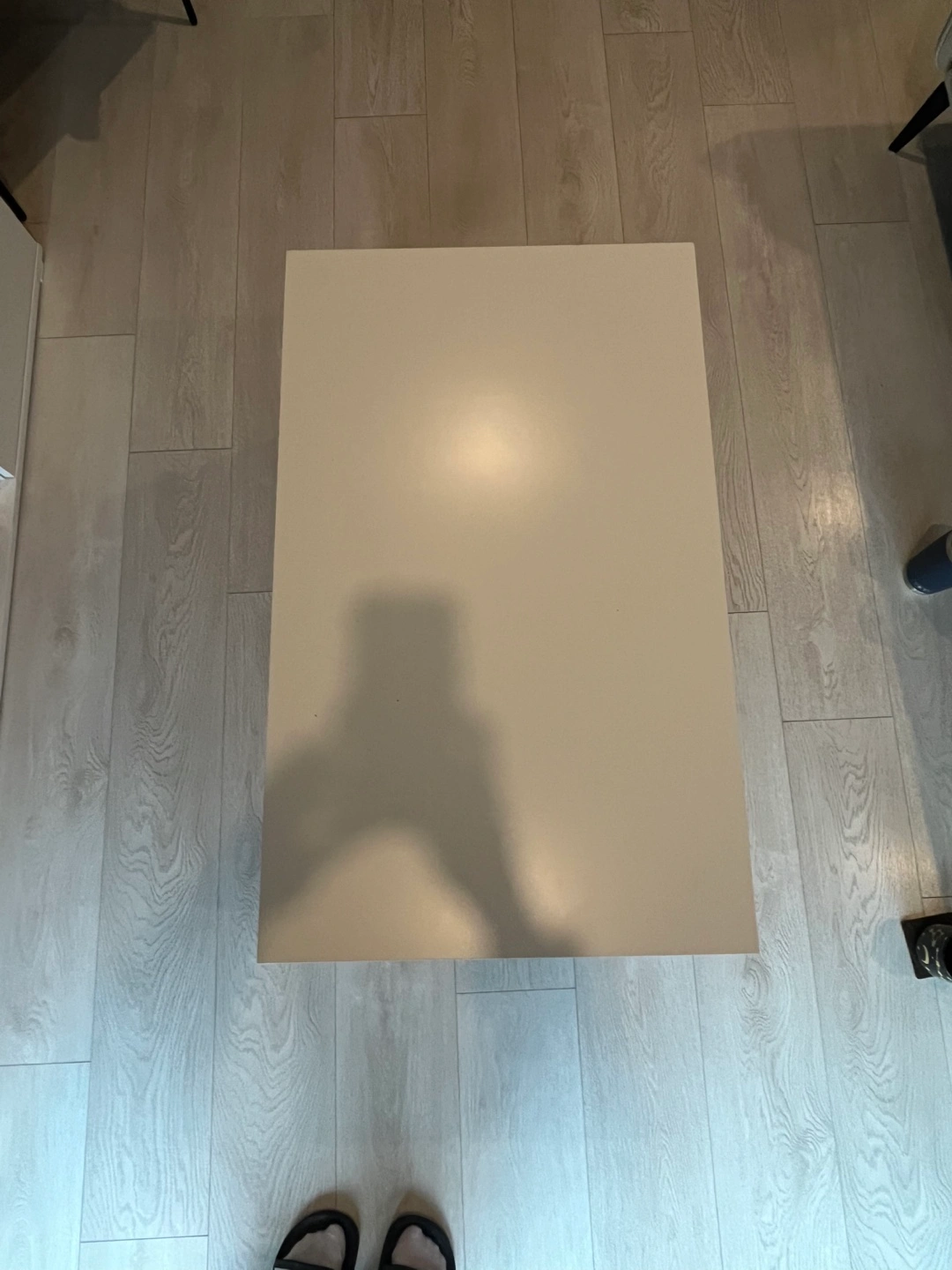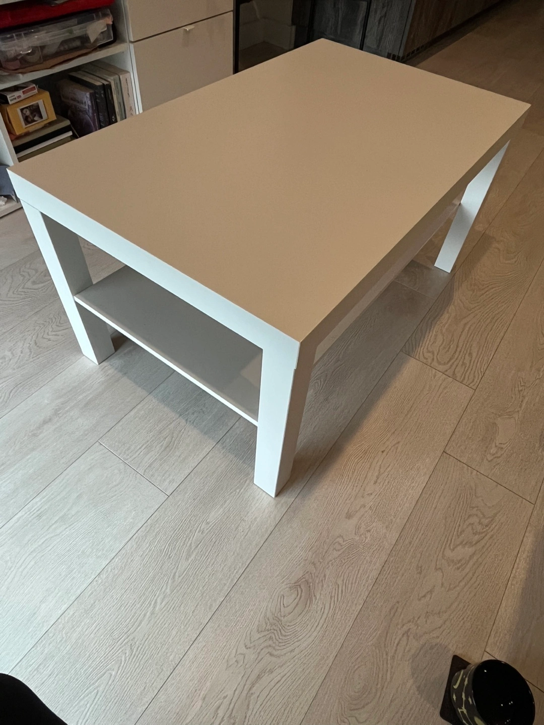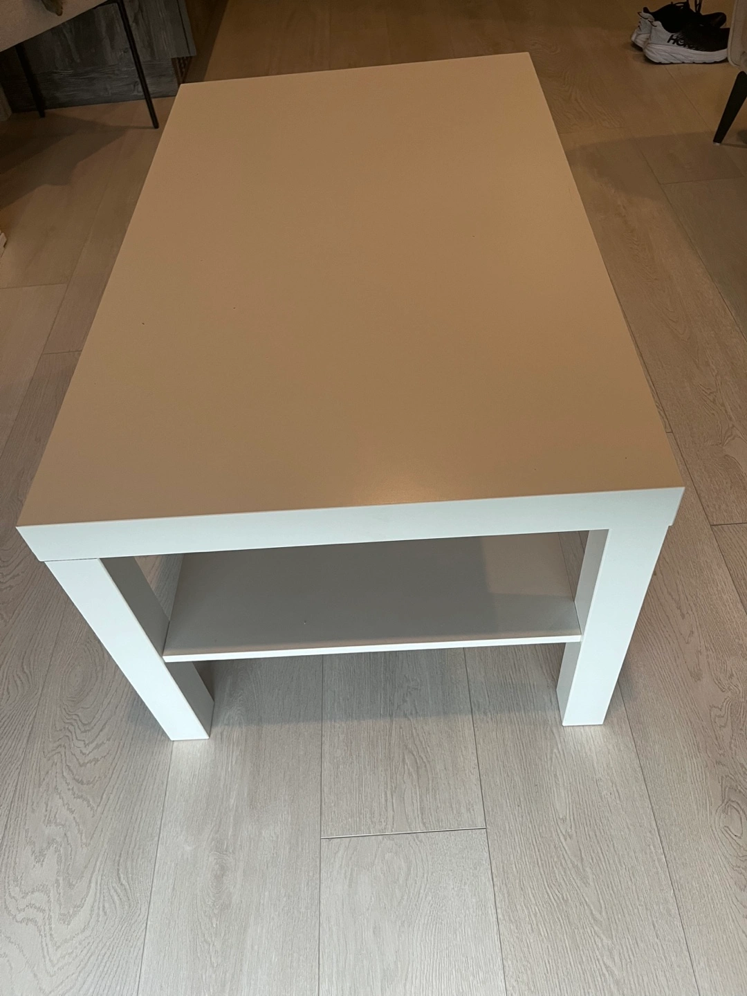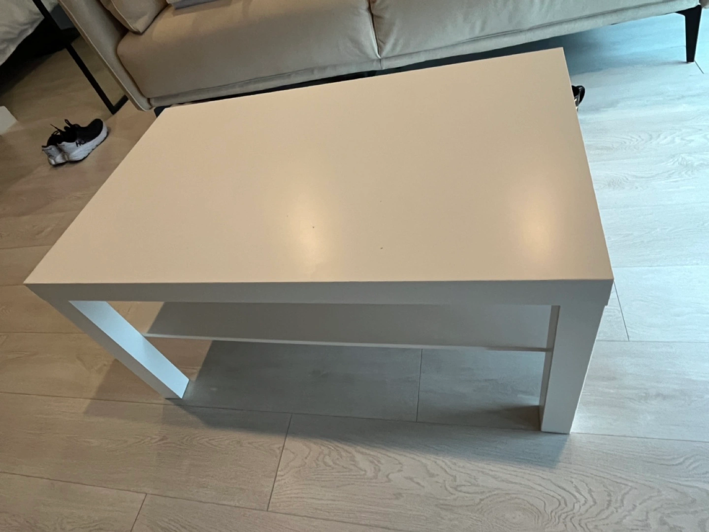 White coffee table with a shelf. Good condition. Used for about a year. Dimensions: 95 cm w x 55 cm depth and 45 cm height. Perfect for a small space / all your DIY projects.