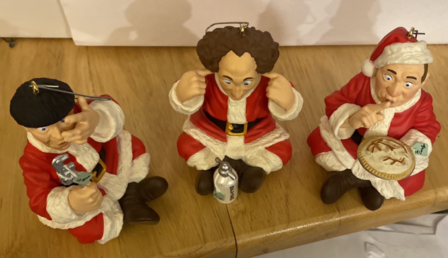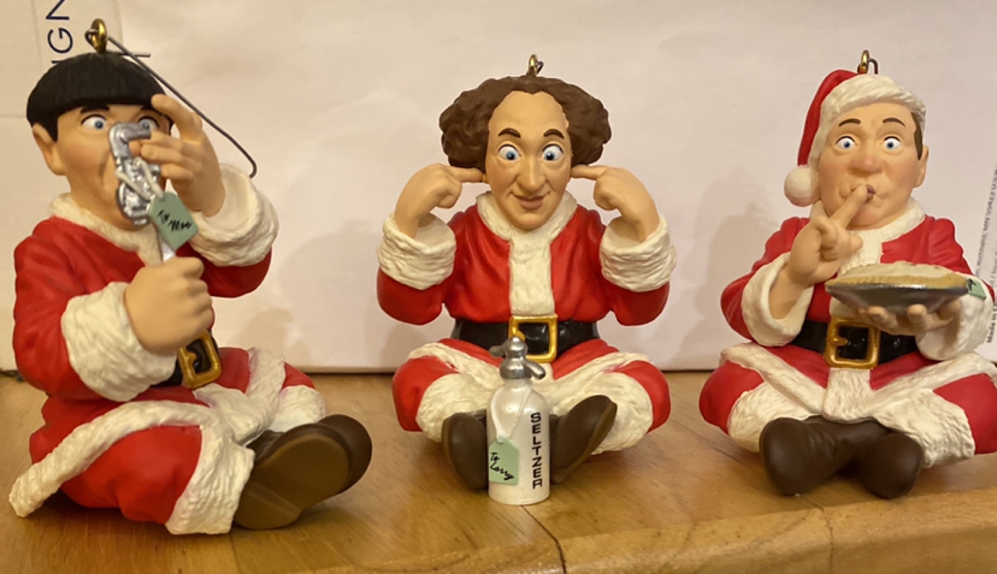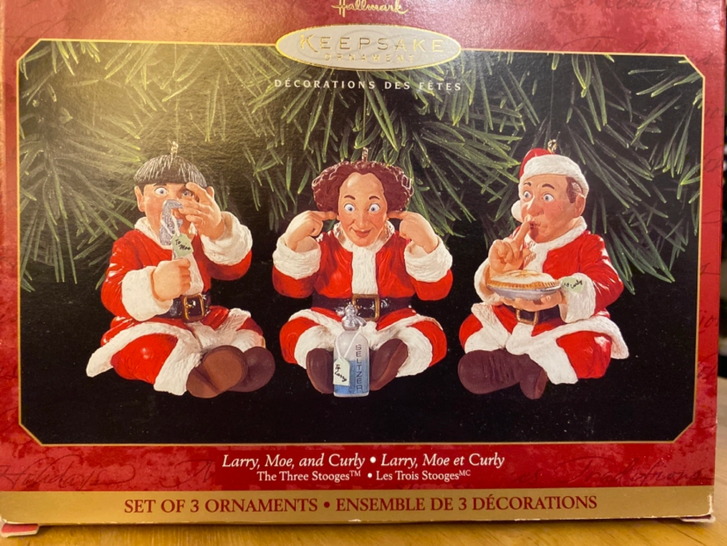 Set of 3 Hallmark Keepsake ornaments featuring Larry, Moe, and Curly as Santa Claus. Can be hung on tree or can sit on a flat surface. Always kept in box outside of Christmas season.