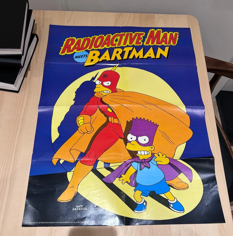 Radioactive Man poster, Bartman poster, The Simpsons poster 1993, vintage Simpsons poster, Bart Simpson superhero, Simpsons comic art, 90s animation memorabilia, pop culture poster, cartoon collectible, Springfield comics, classic Simpsons art"
