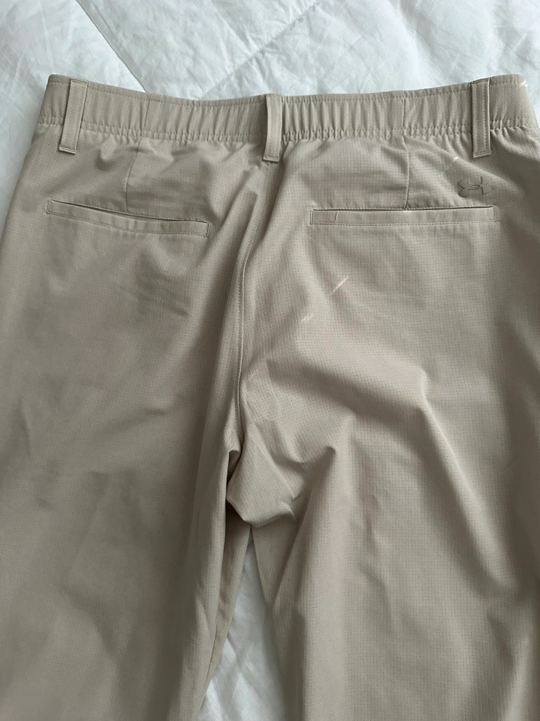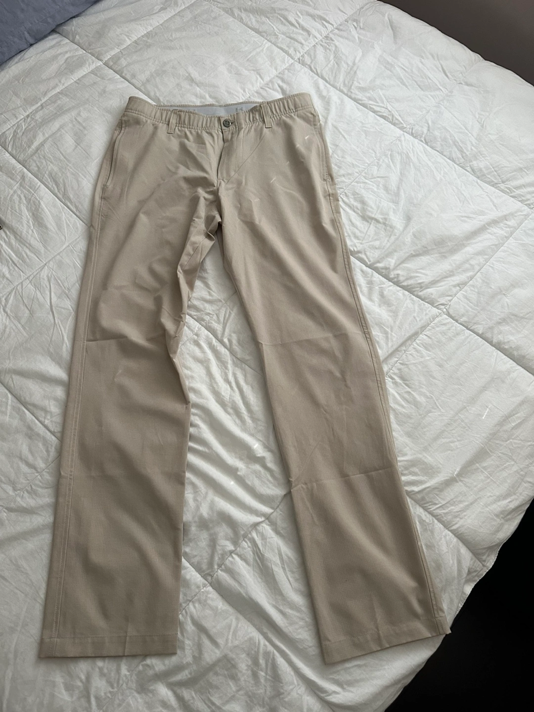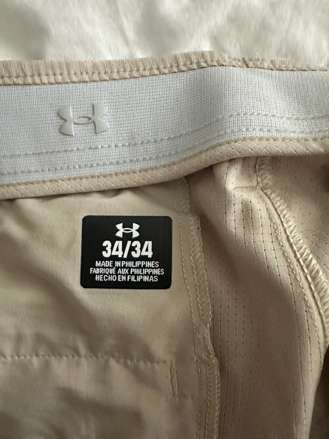 Beige Under Armour athleisure pants with a straight leg and an elastic waistband.