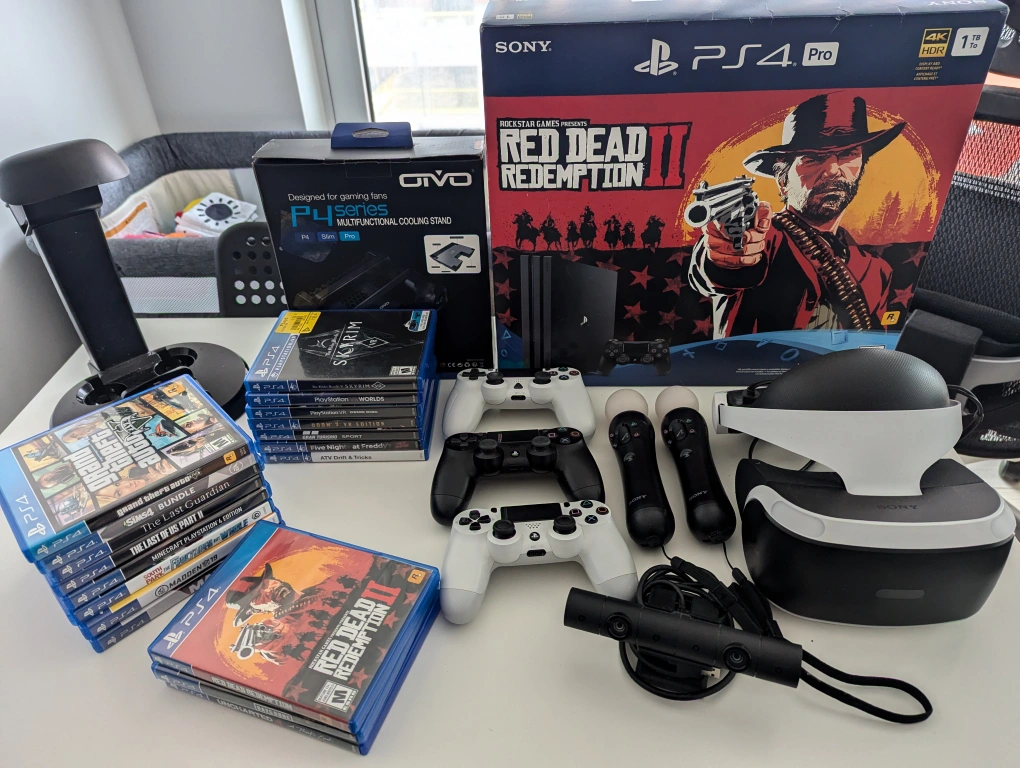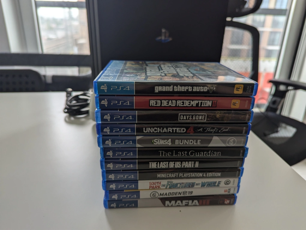 • 11 PS4 games (Red Dead Redemption 2, Days Gone, Uncharted 4, GTA 5, SIMS 4 Eco Bundle, The Last Guardian, The Last of Us Part 2, Minecraft, South Park: The Fractured but Whole, Madden 19, Mafia 3)