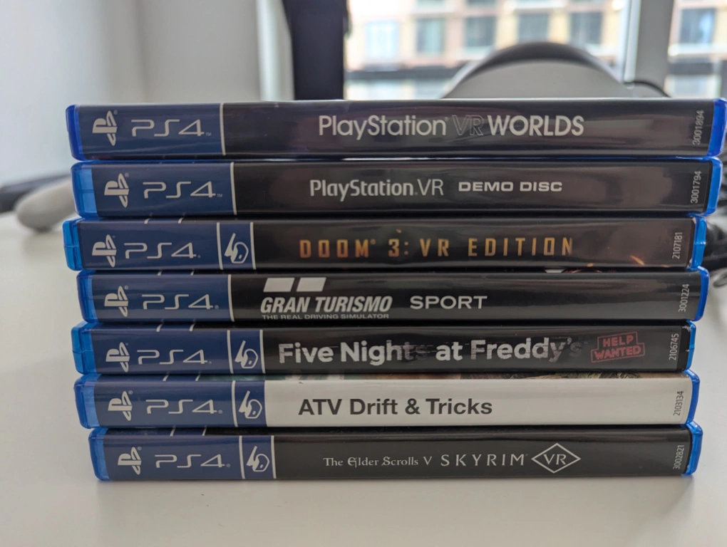 • 7 VR games (Skyrim, PlayStation VR Worlds, PS VR Demo Disk, Doom 3, Gran Turismo Sport, Five Nights at Freddy’s, ATV Drift & Tricks)