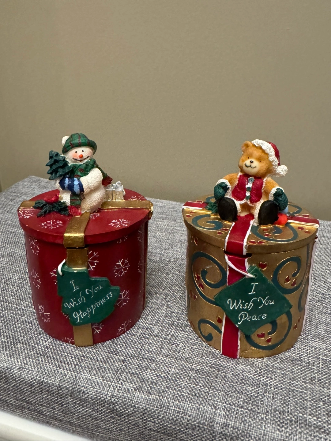 Set of 2 Christmas gift boxes. One features a snowman and the other a teddy bear on top of the lid.