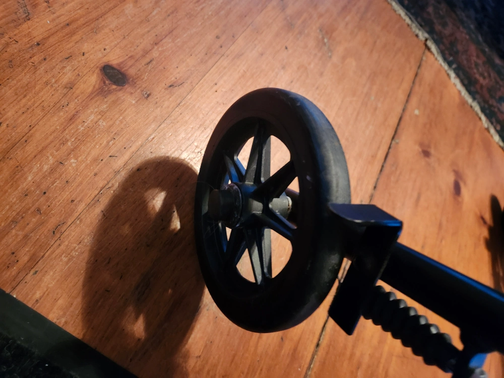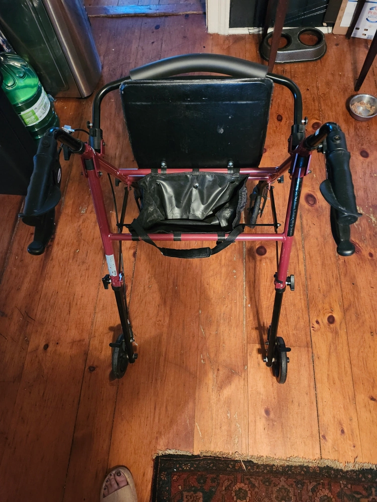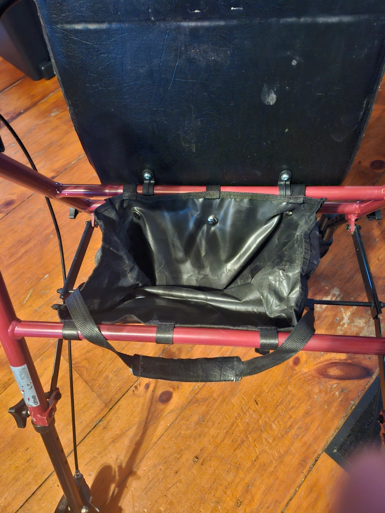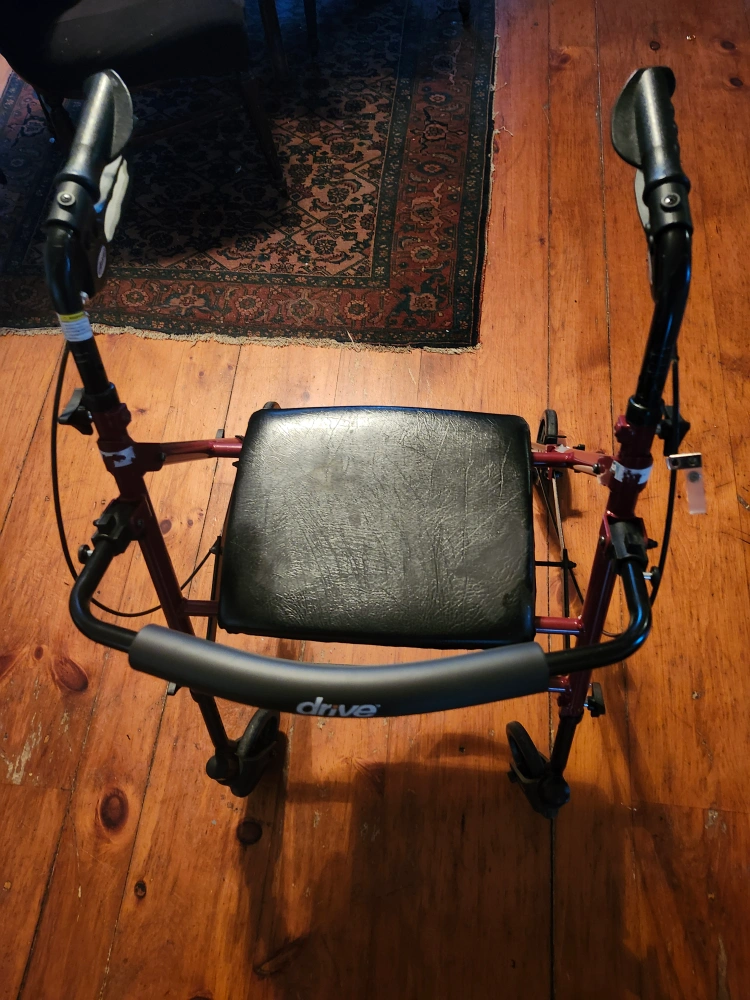 Folding walker with seat and basket. Includes handbrakes. Great for supporting mobility.