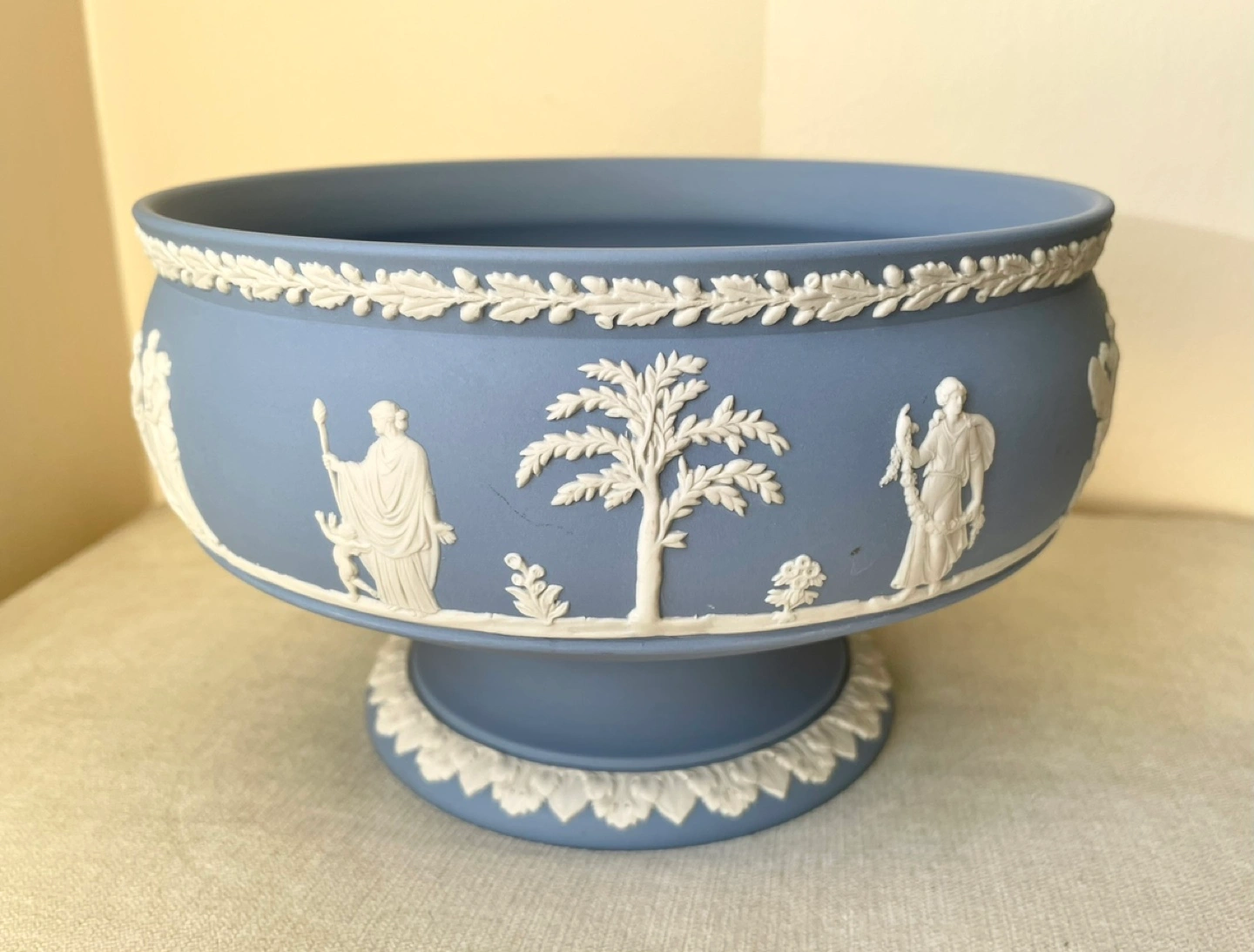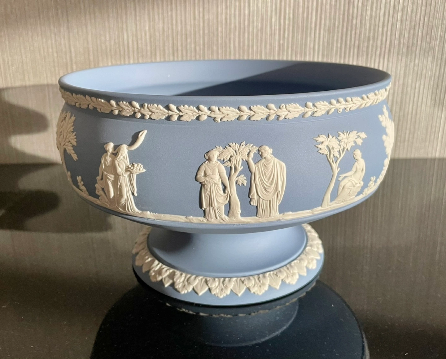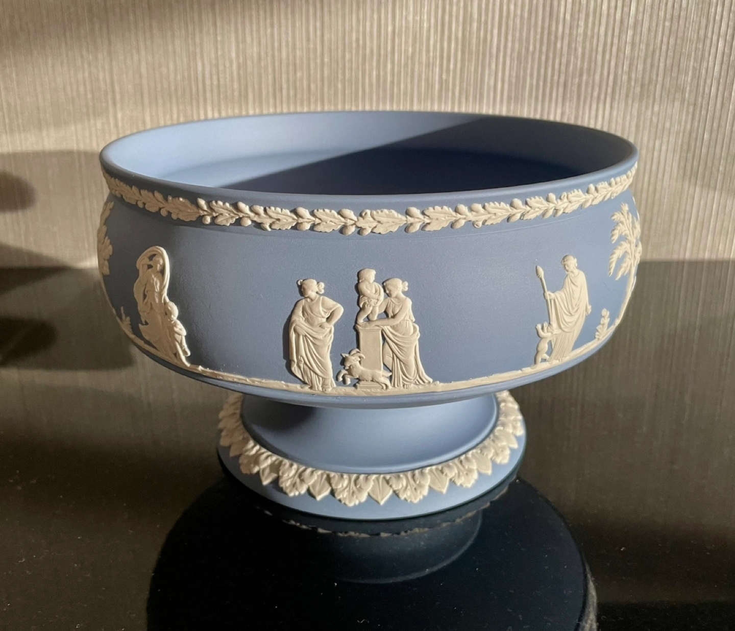 Vintage Wedgwood blue jasper ware footed pedestal bowl with white "Neoclassical Figures" relief appliqués. My grandmother purchased this footed bowl on a trip to London.
