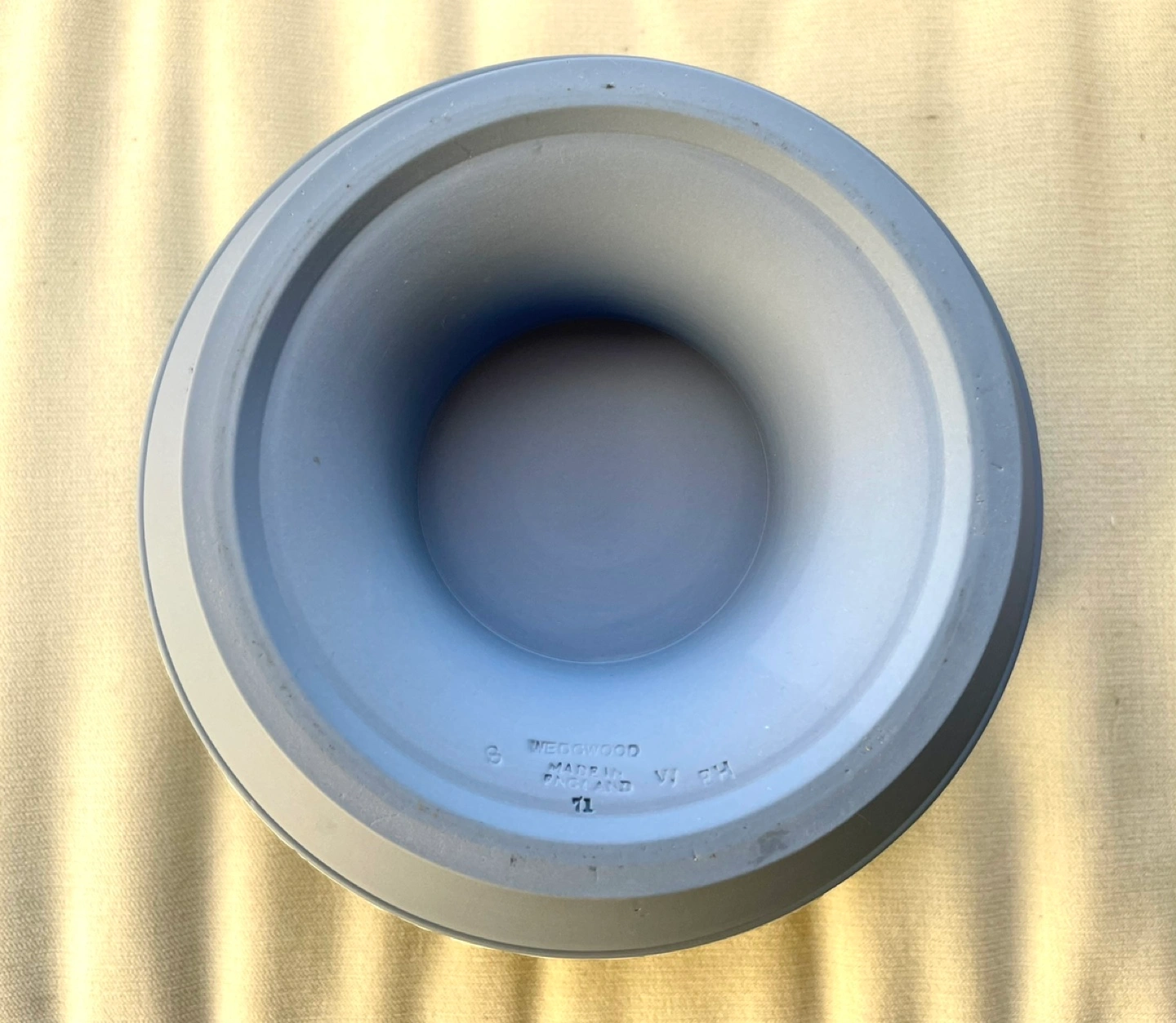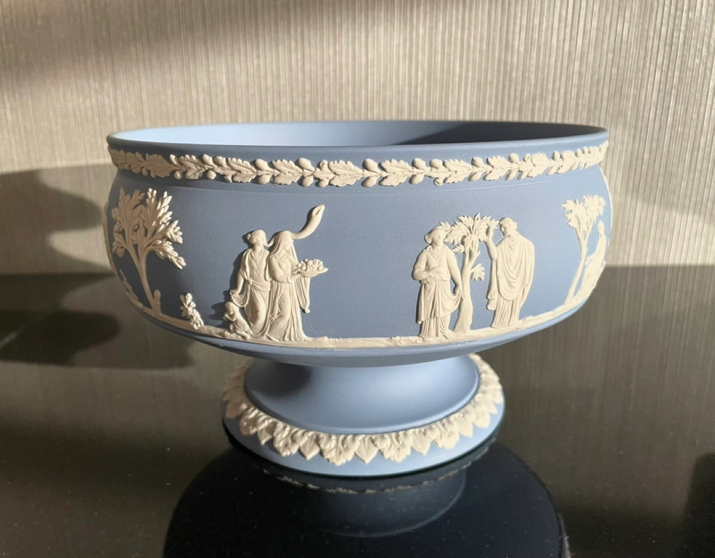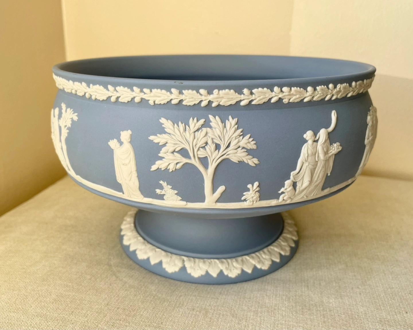 Vintage Wedgwood blue jasper ware footed pedestal bowl with white "Neoclassical Figures" relief appliqués. My grandmother purchased this footed bowl on a trip to London.