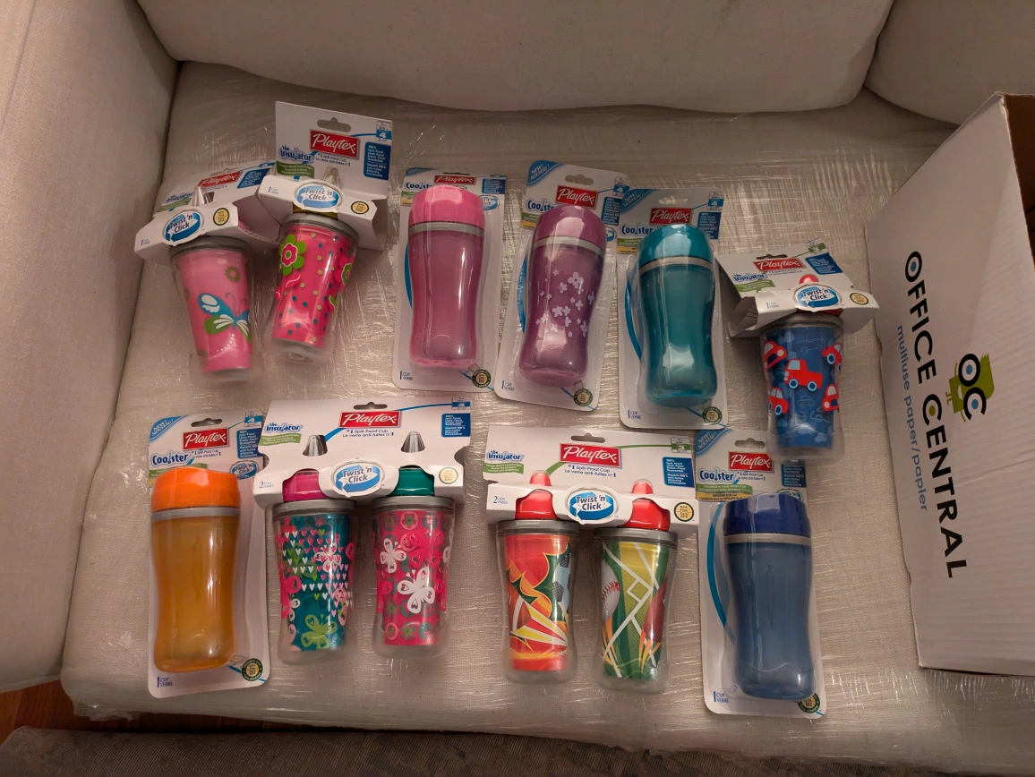 Various Playtex Twist'n Click insulated cups. Includes both the 'Coolster' and 'Insulator' styles in a variety of colors and designs. selling them as a lot or separately. singles are 5. doubles 10.