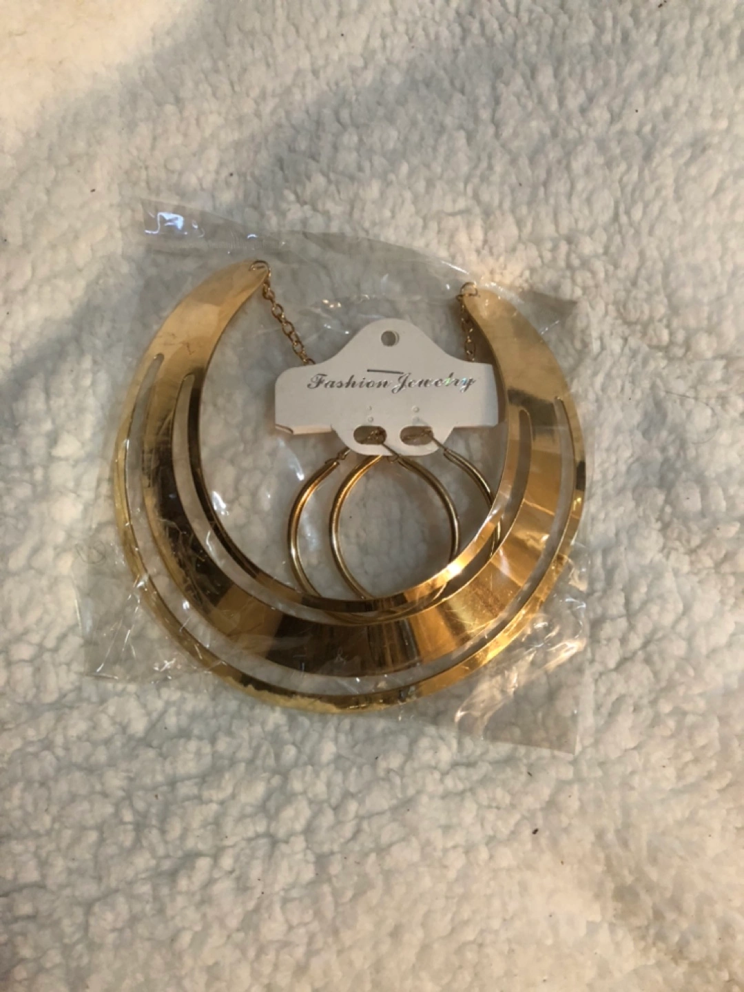 Gold choker necklace and earrings set. Comes with two pairs of earrings, one large hoop and one smaller hoop.