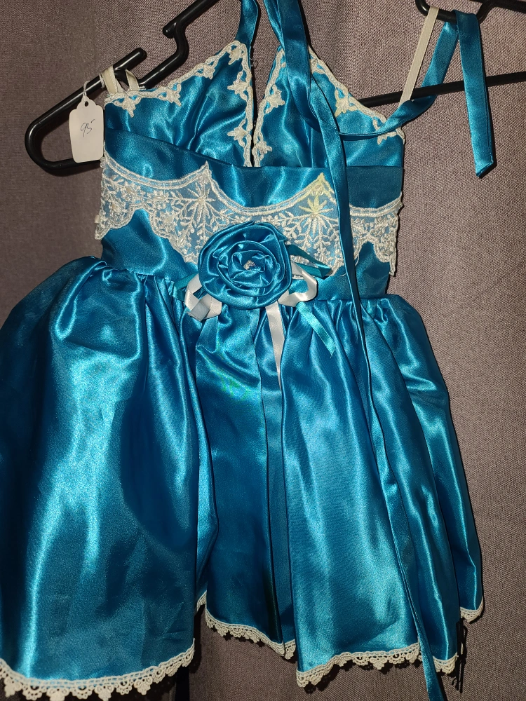 Teal satin halter dress with white lace accents and a white satin ribbon around the waist. Has a large white rose on the back.