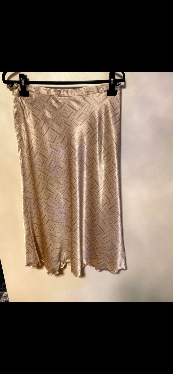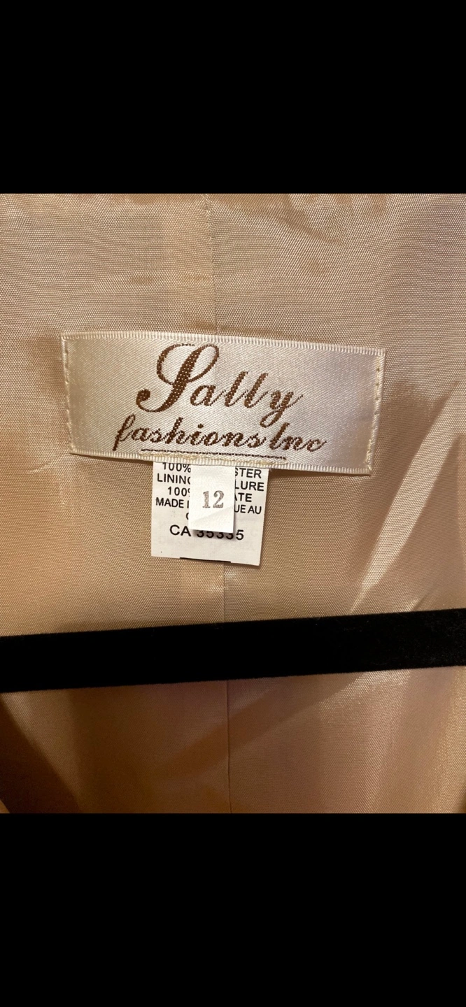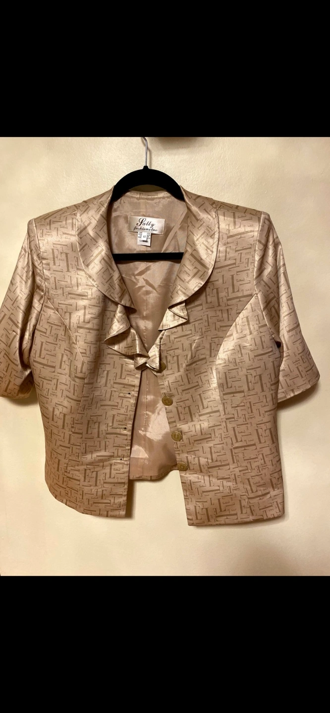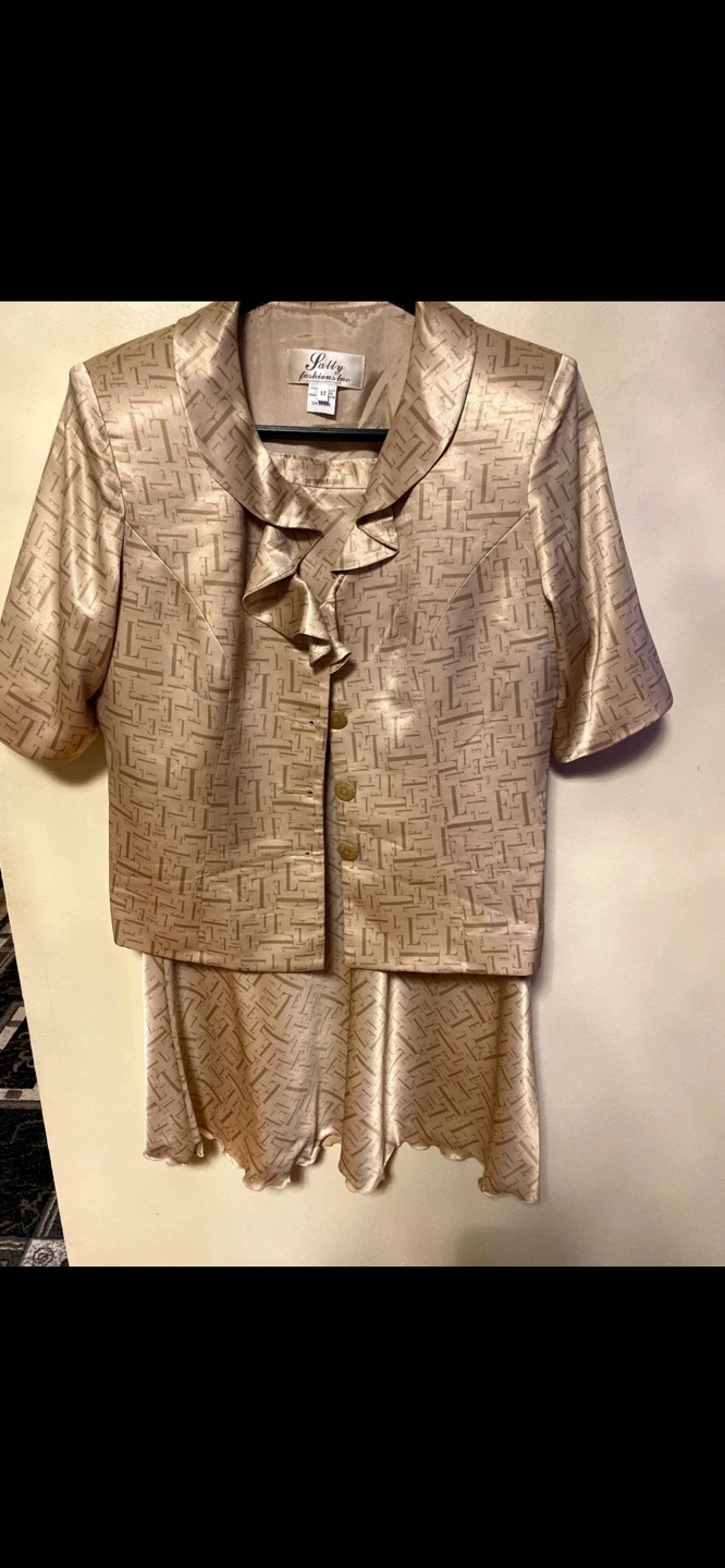 Beige skirt suit with a matching jacket and skirt. Both pieces have a subtle geometric pattern and are made of a silky fabric. The jacket has a ruffled neckline. Size 12