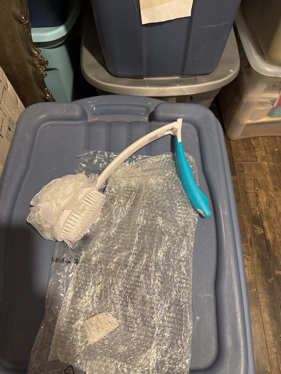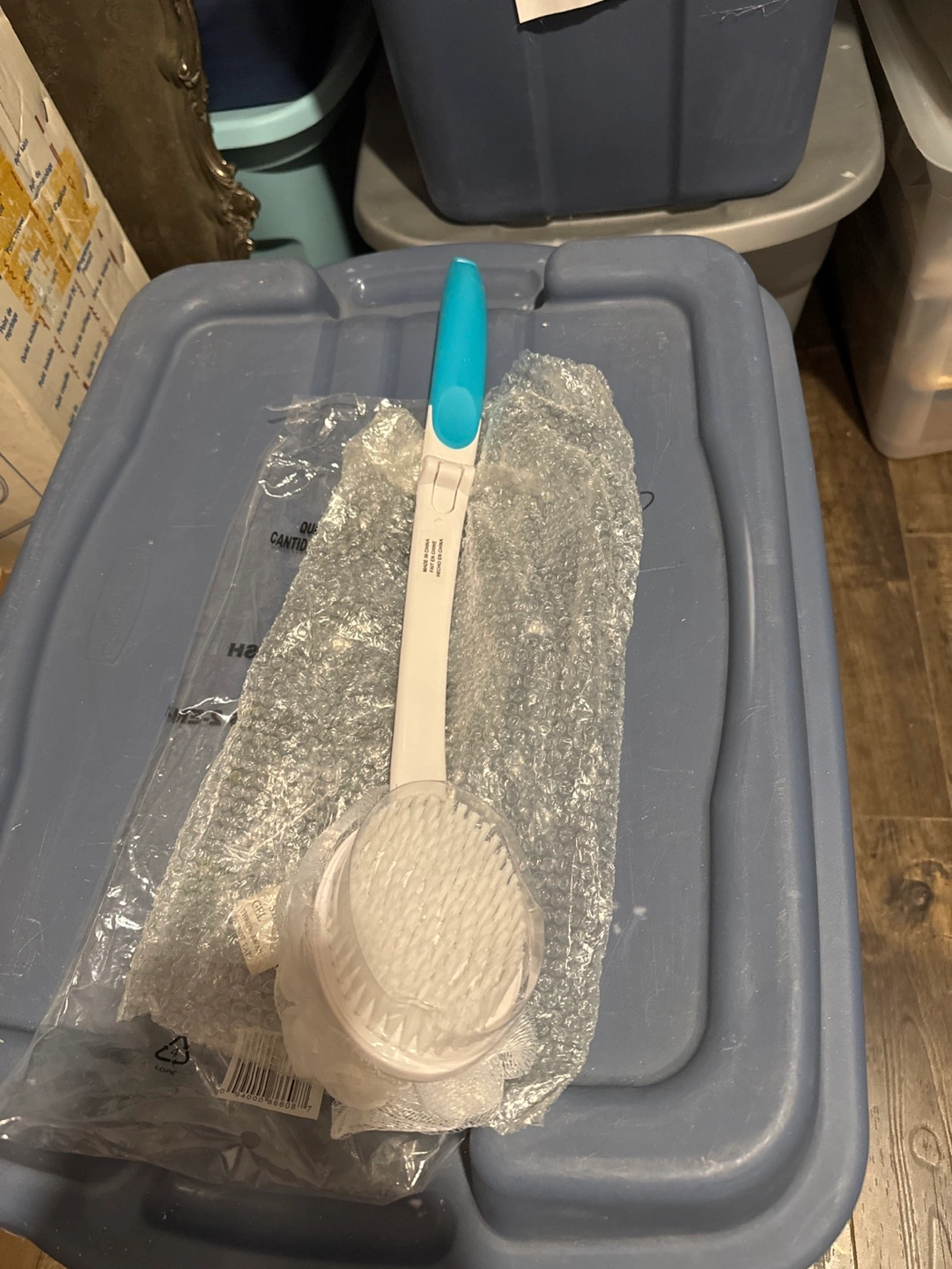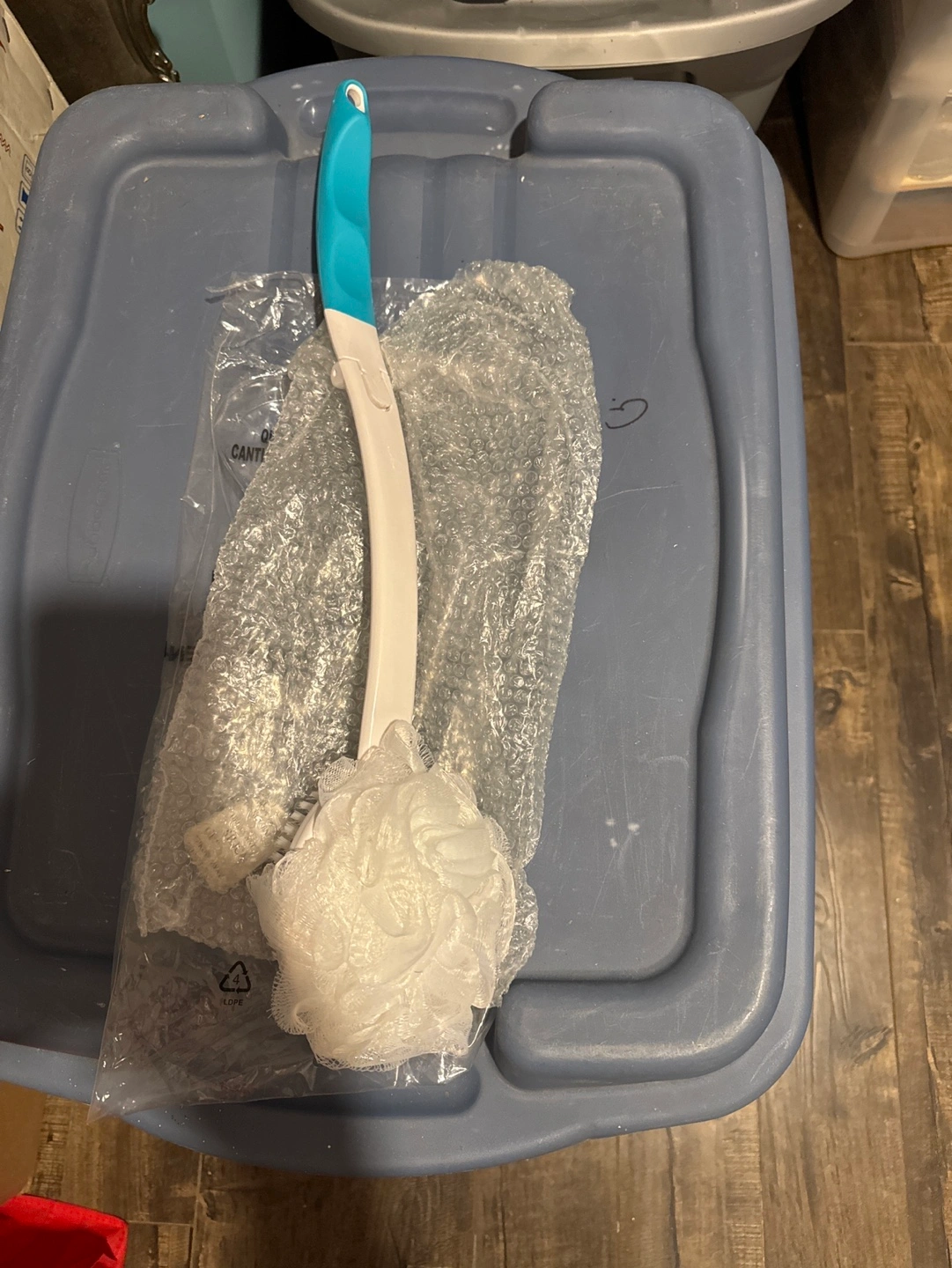 New, unused back scrubber with a long handle. Comes with a mesh scrubber head. Perfect for reaching those hard-to-reach areas.