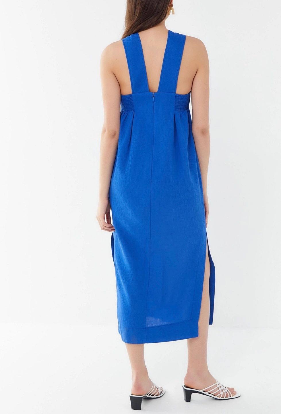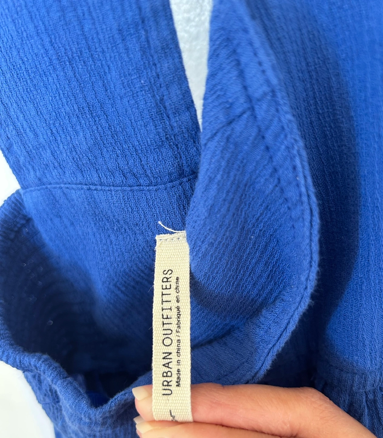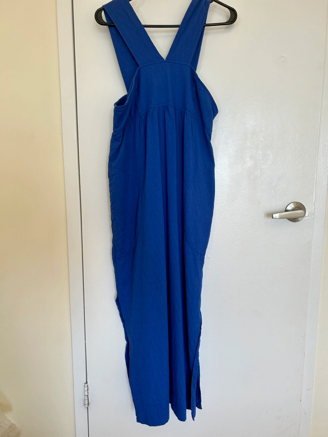 Urban Outfitters royal blue maxi dress made from a lightweight cotton in an empire-waist design. Relaxed fit topped with thick shoulder straps at the Y-neck + finished with side slit accents and pockets at the waist.
