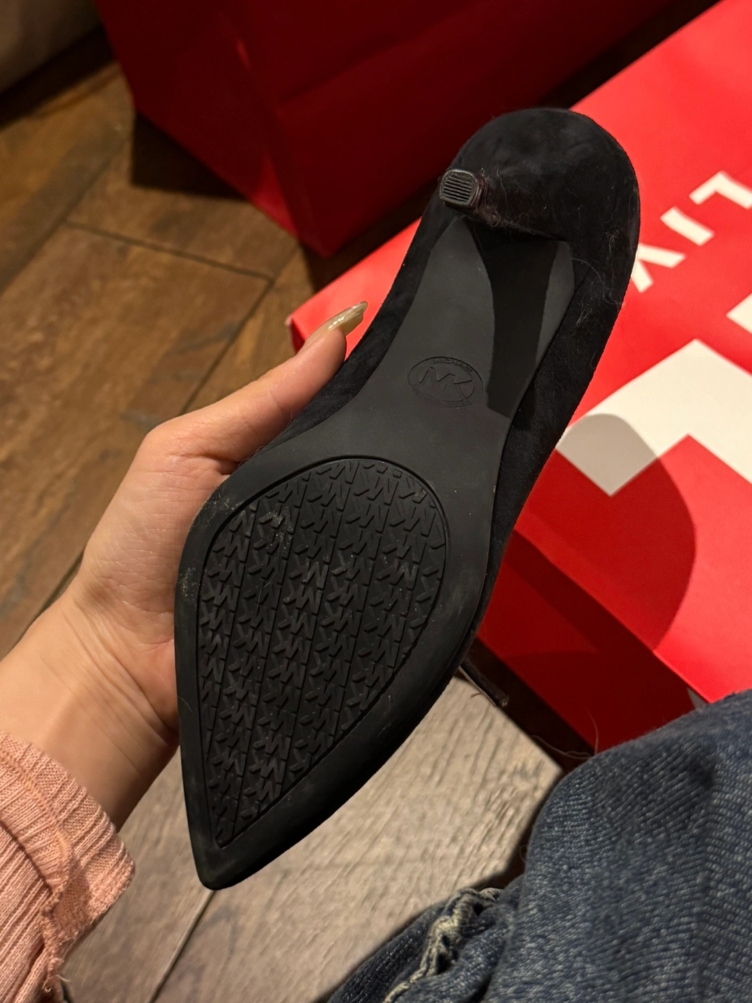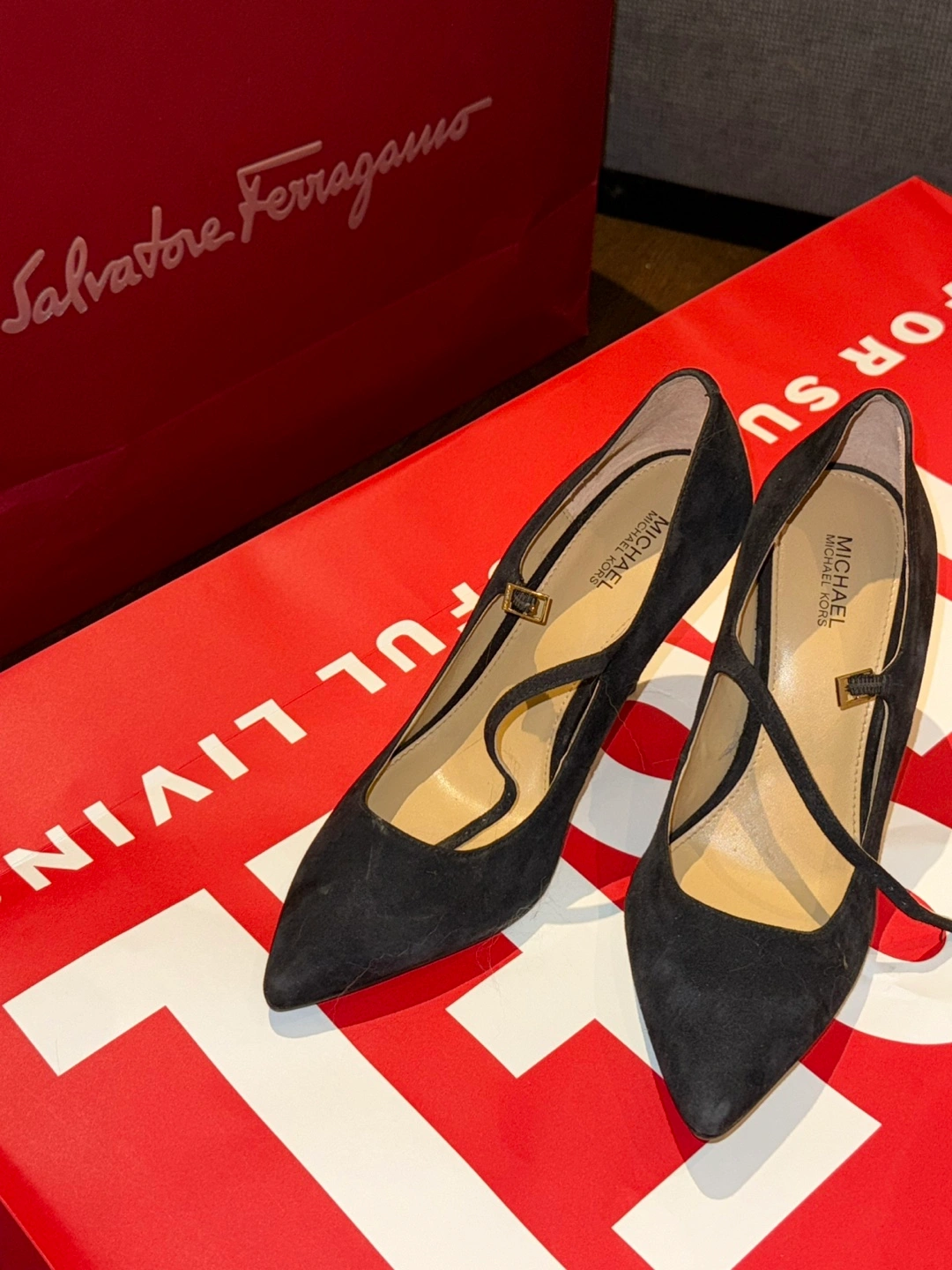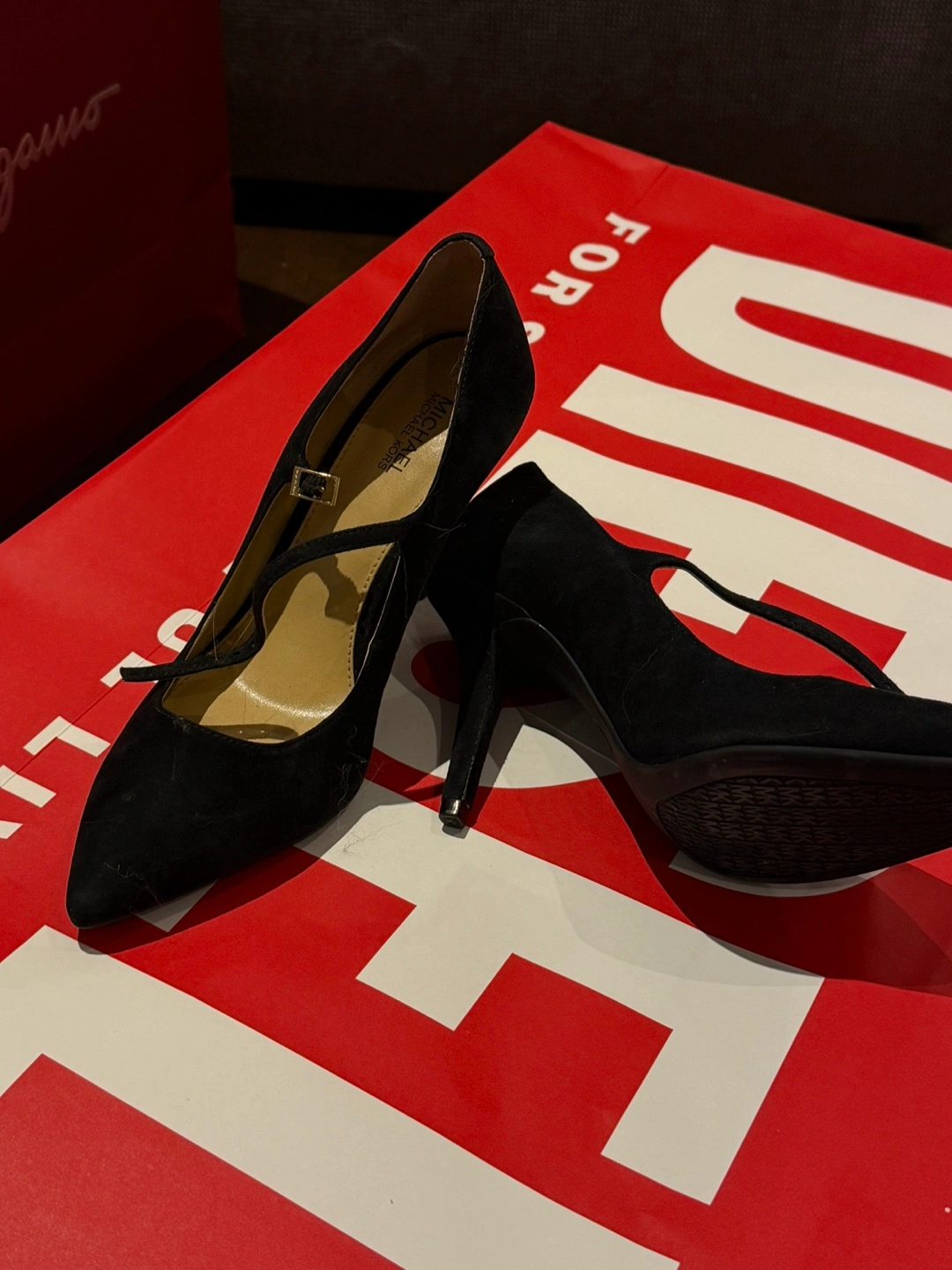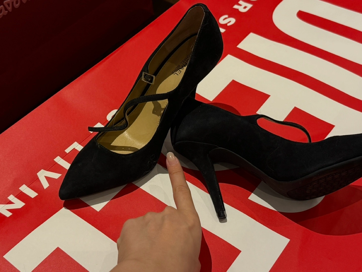 Black suede heels with buckle detail. Pointed toe and high heel.
