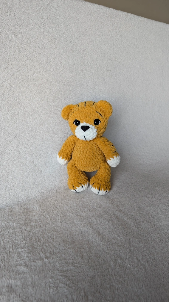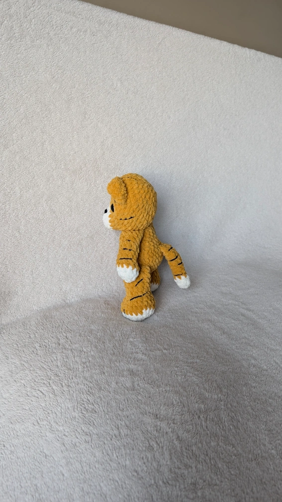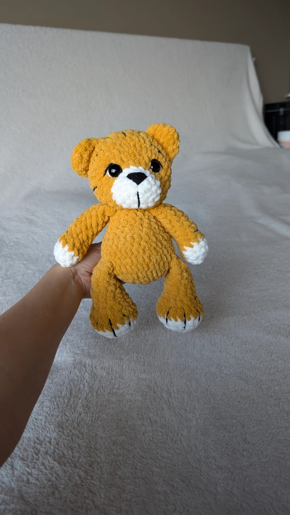 Crocheted tiger stuffed animal with little details of embroidered eyes and mouth