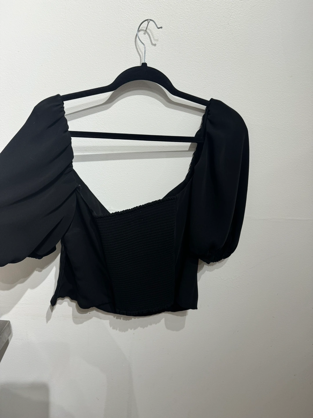 Black crop top with puff sleeves and a sweetheart neckline. Short sleeves and a fitted silhouette.