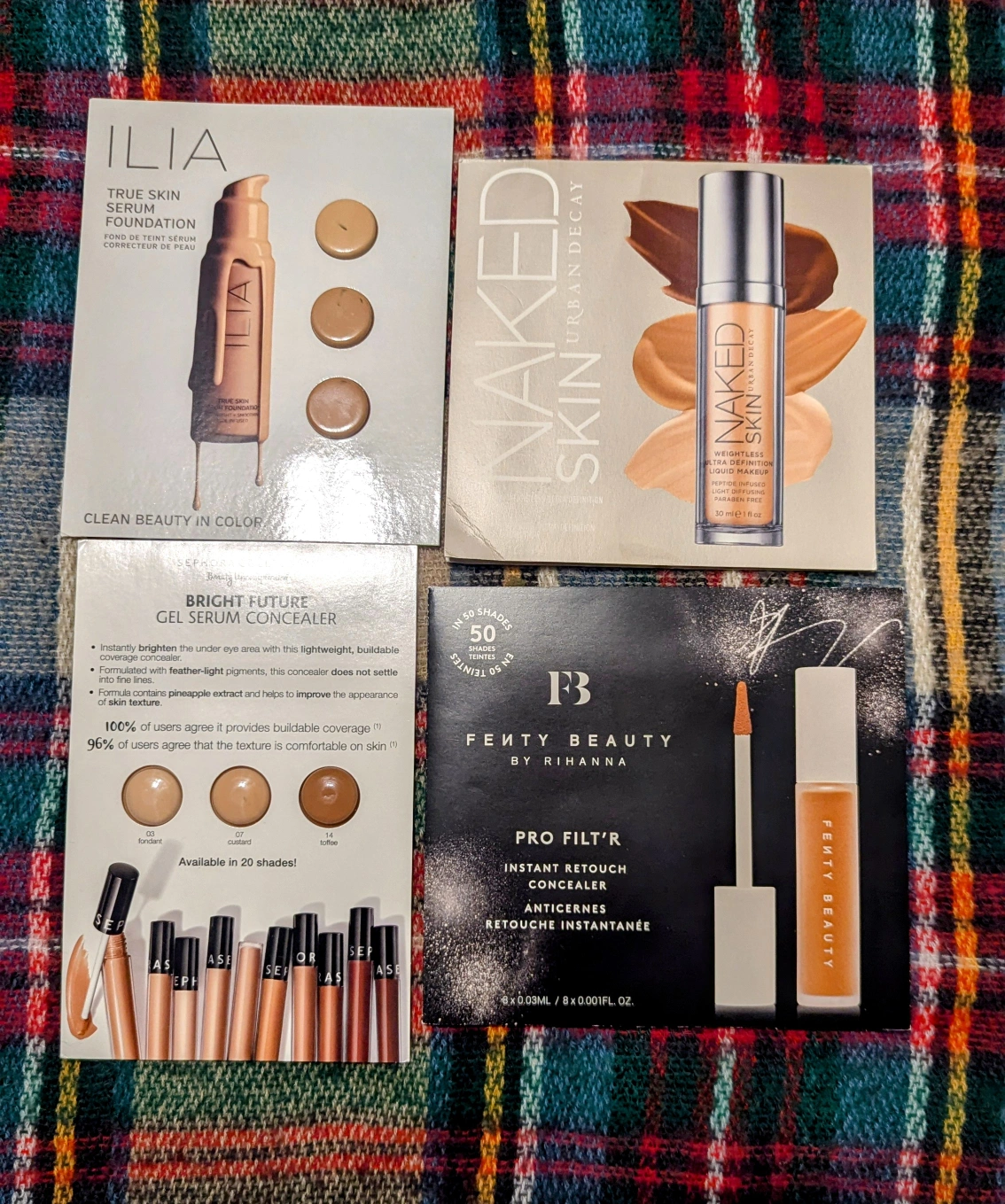 Foundation and concealer samples in various shades from Ilia, Fenty Beauty, Sephora collection and Urban Decay.