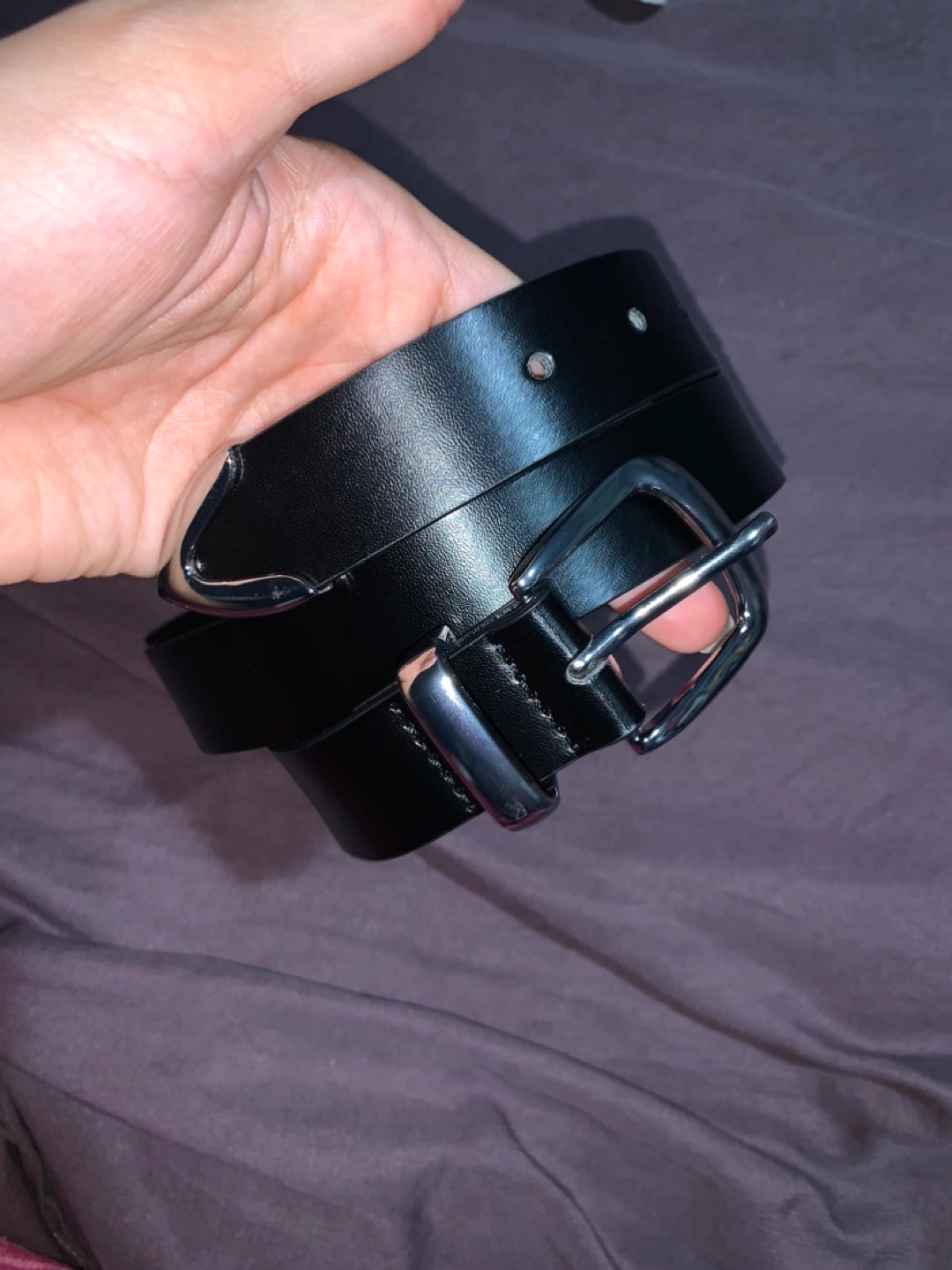 Black belt with silver buckle. The buckle has a unique V-shape design. The belt is brand new!