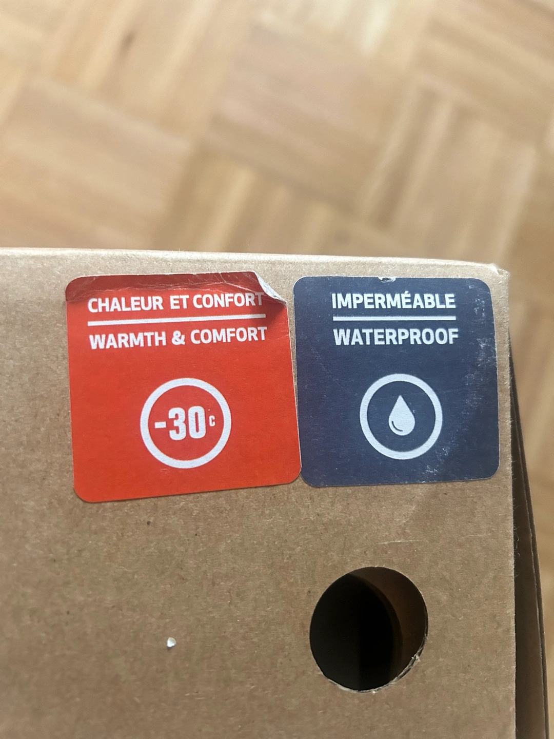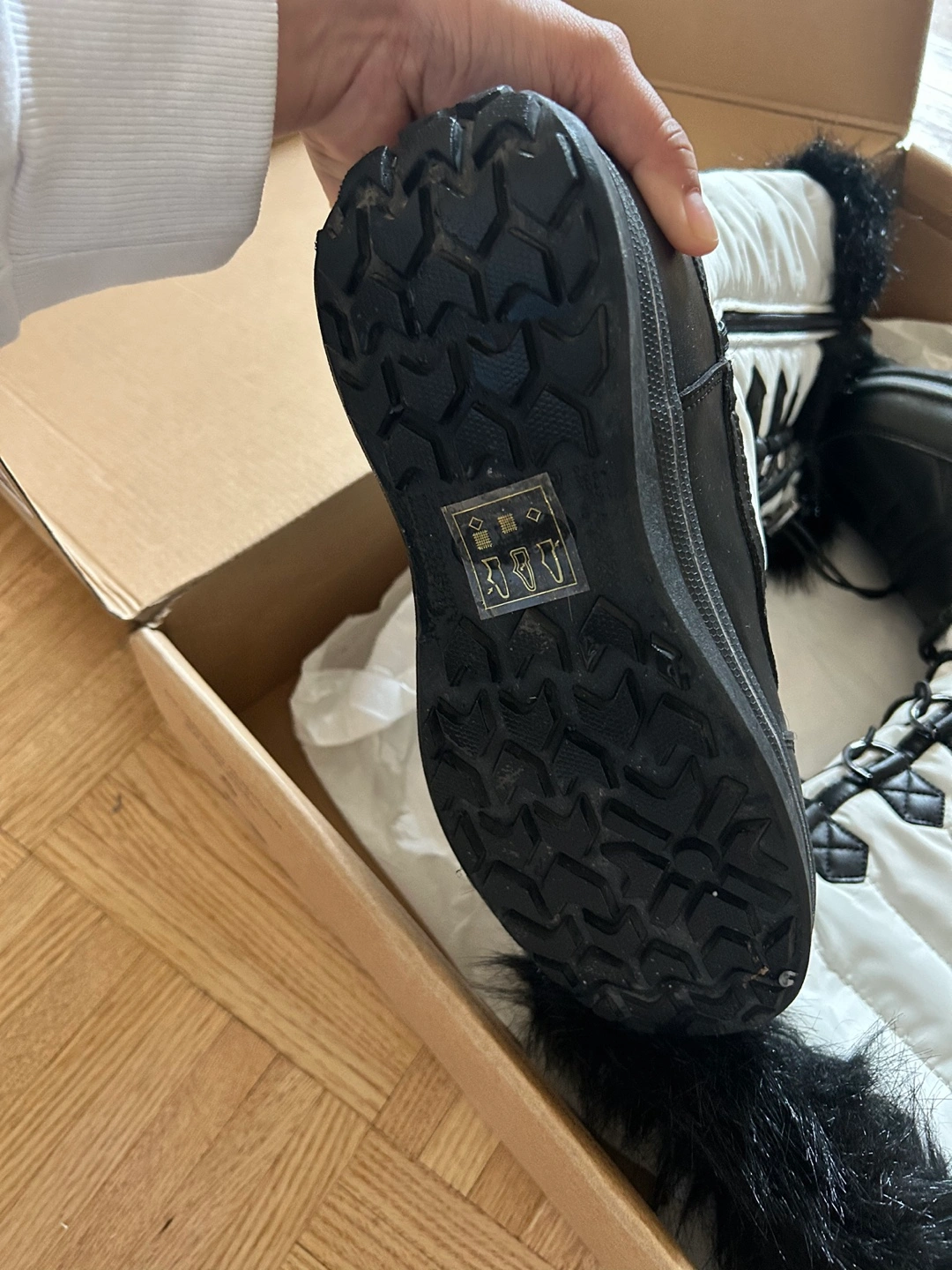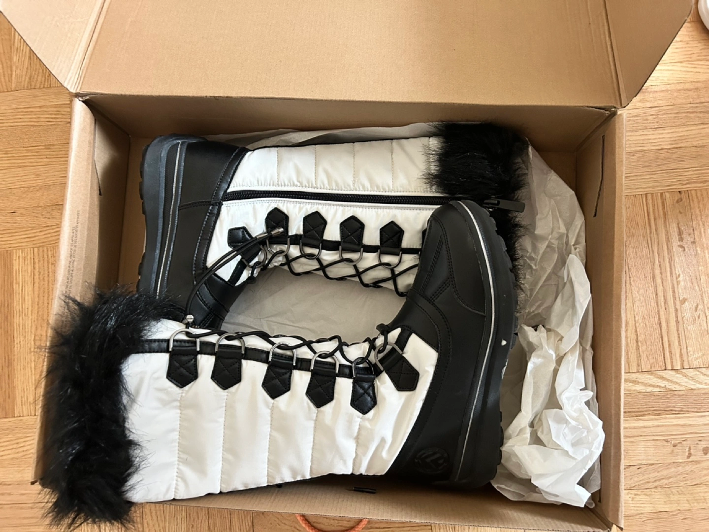 White and black winter boots with fur trim. Lace-up style, waterproof and rated for -30 degrees.