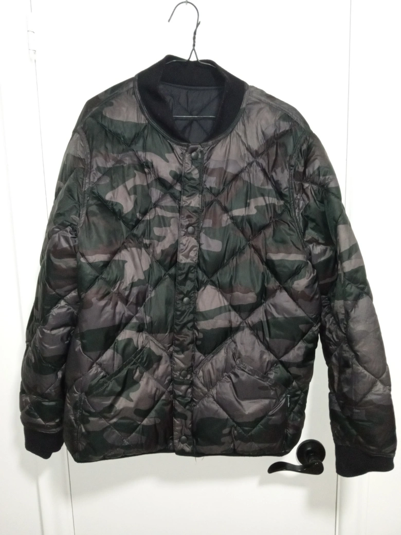 Reversible bomber jacket. Features a camo print on one side and black on the other. Size L