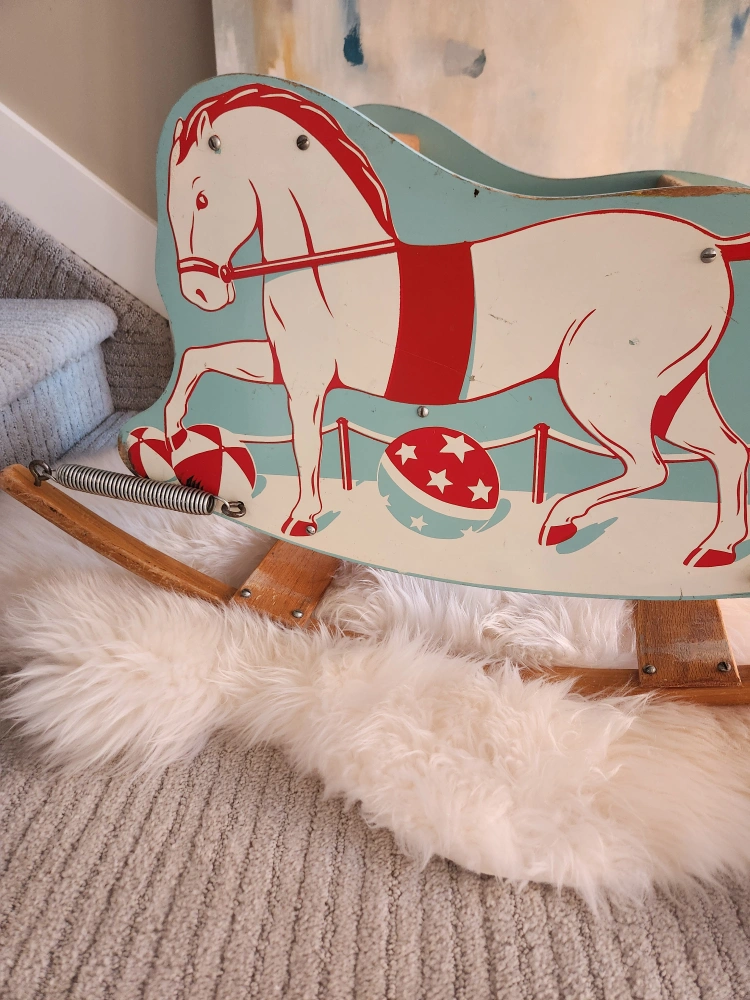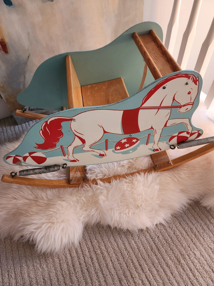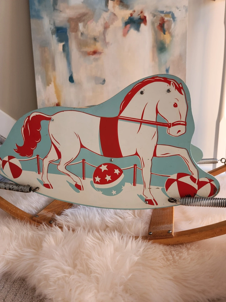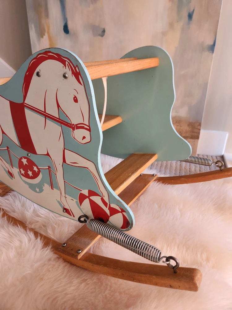 What a darling 1950's rocking horse! This horse with wood runners and springs is a wonderful historical toy. Great workmanship and delightful post war decor measures 33 long, 14 wide and 17 high. What a delight find for a child or anyone who appreciates whimsical vintage decorWooden rocking horse with blue, red, and white paint. Has a metal spring mechanism.