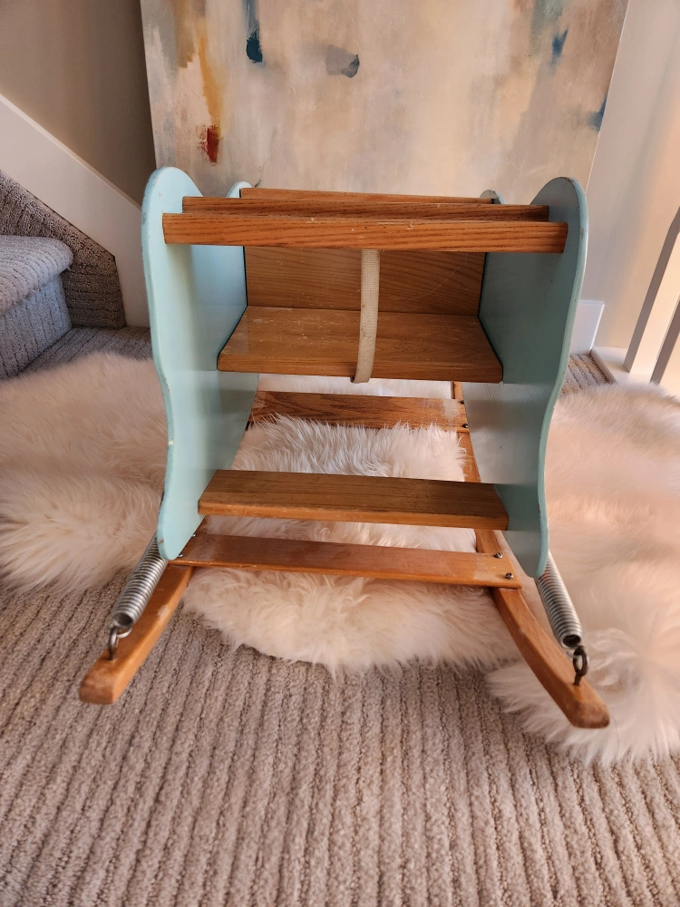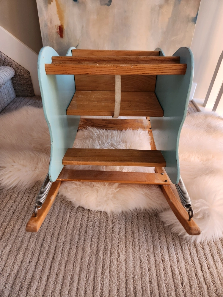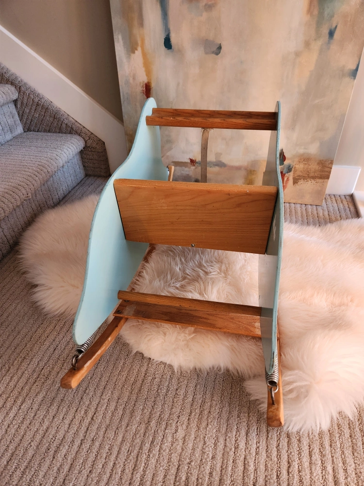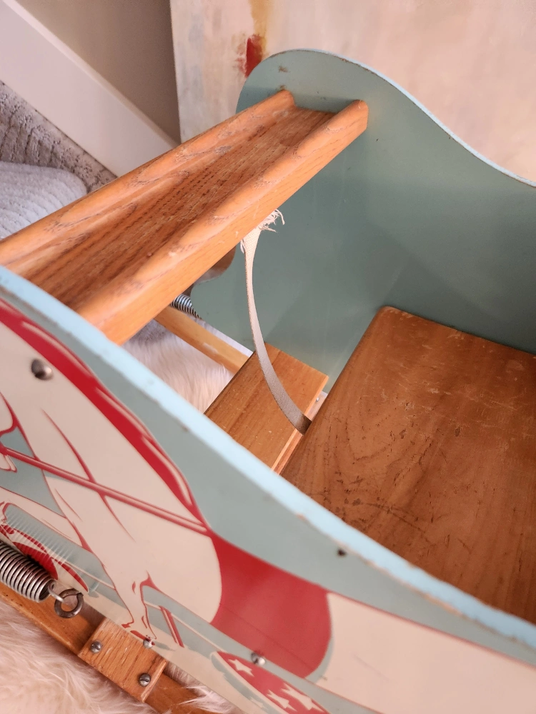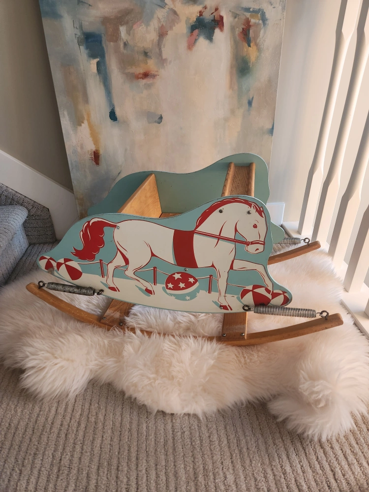 What a darling 1950's rocking horse! This horse with wood runners and springs is a wonderful historical toy. Great workmanship and delightful post war decor measures 33 long, 14 wide and 17 high. What a delight find for a child or anyone who appreciates whimsical vintage decorWooden rocking horse with blue, red, and white paint. Has a metal spring mechanism.