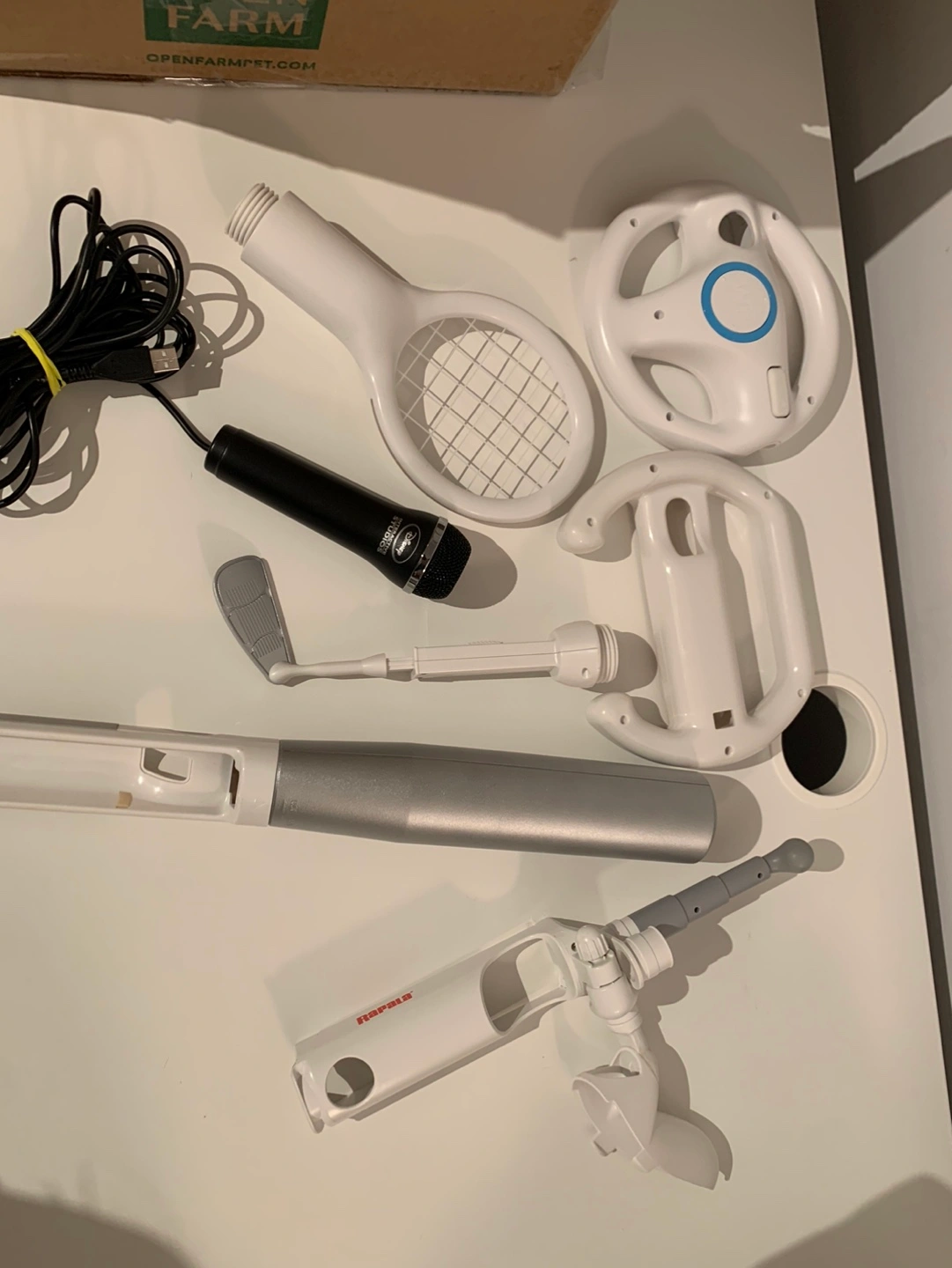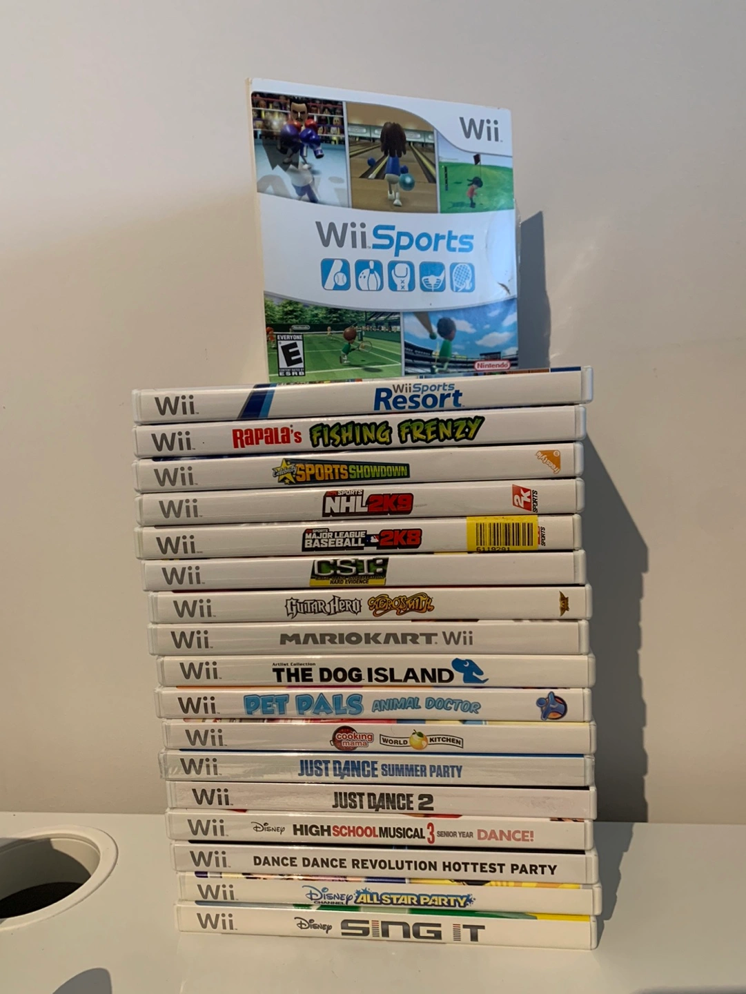 1000+Please read all, ~ EVERYTHING IS INCLUDED! ~ •Bundle of Wii Sports console + EVERYTHING that you see in the pictures is included! Multiple accessories, 17 games, wires, games props (🏎️🛞,🏎️🛞, ⚾️, 🎣, 🏒, ⛳️, 🎤, + more). Some of the games are worth $5–>$10, while some as high as $30 —->$60! Sorry, not selling individuals. •Everything is AUTHENTIC!!! We are the original buyer/owner, everything had been purchased brand new and sealed at BestBuy (this is NOT second hand/fake copies). Be careful for online imitations. —————— Pick-up and cash only. Location Map on listing. No holds. Price is firm. Thx! 💛~Look at my other listings for great bundle discounts.