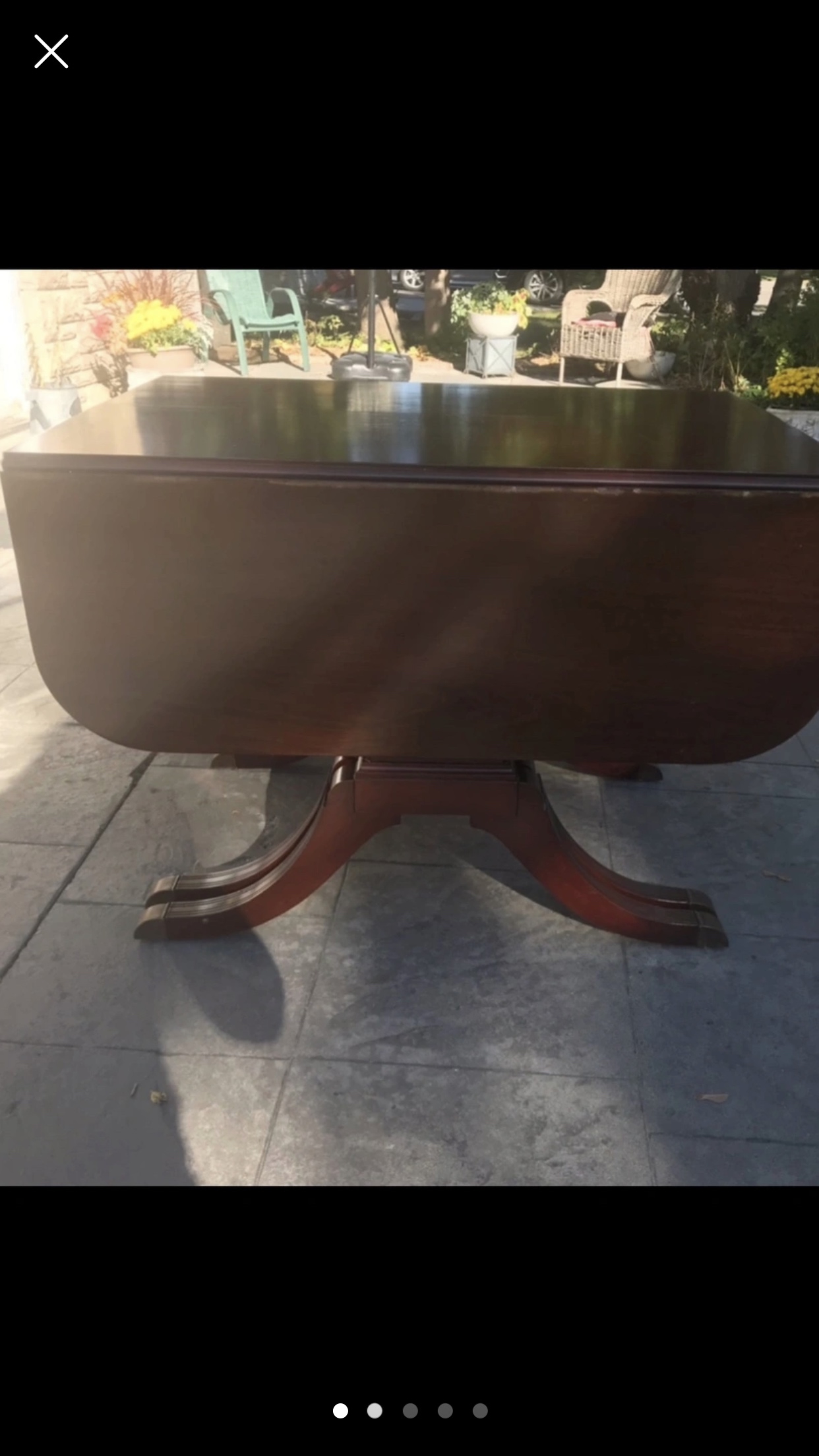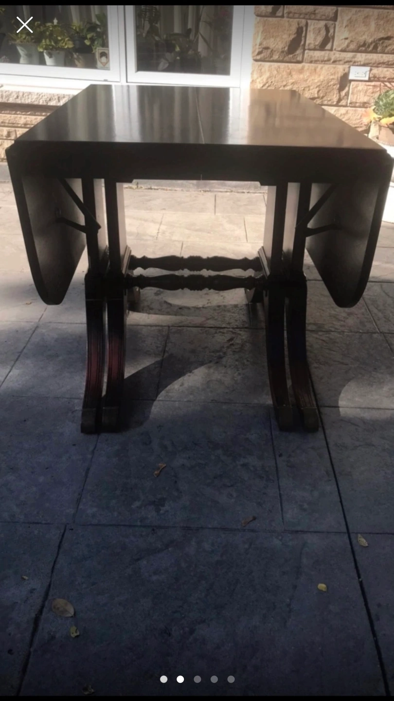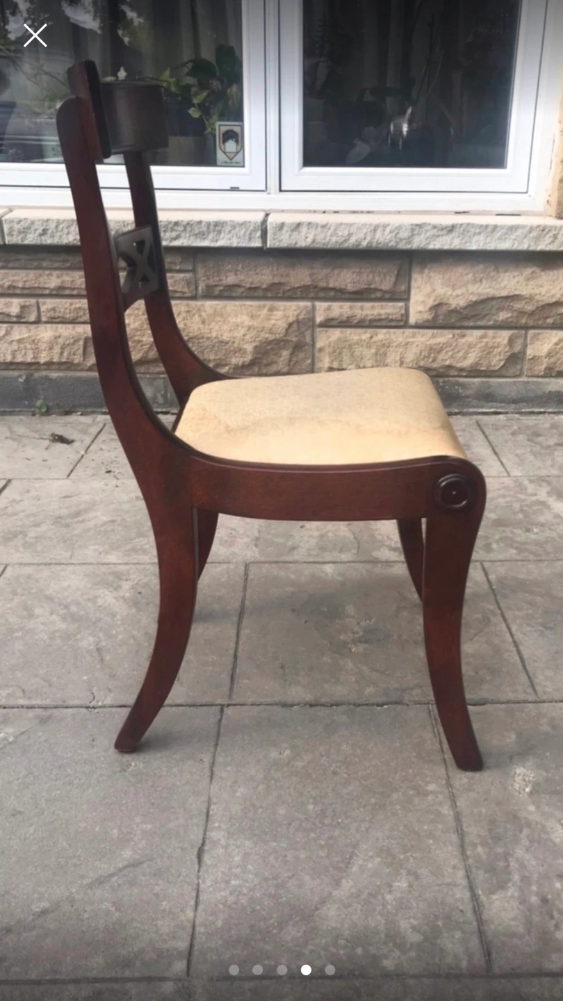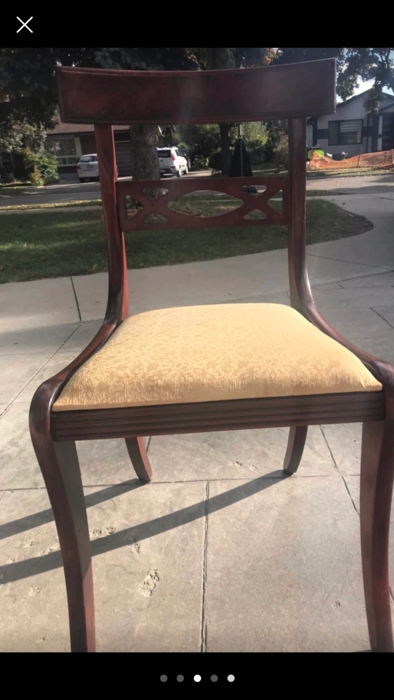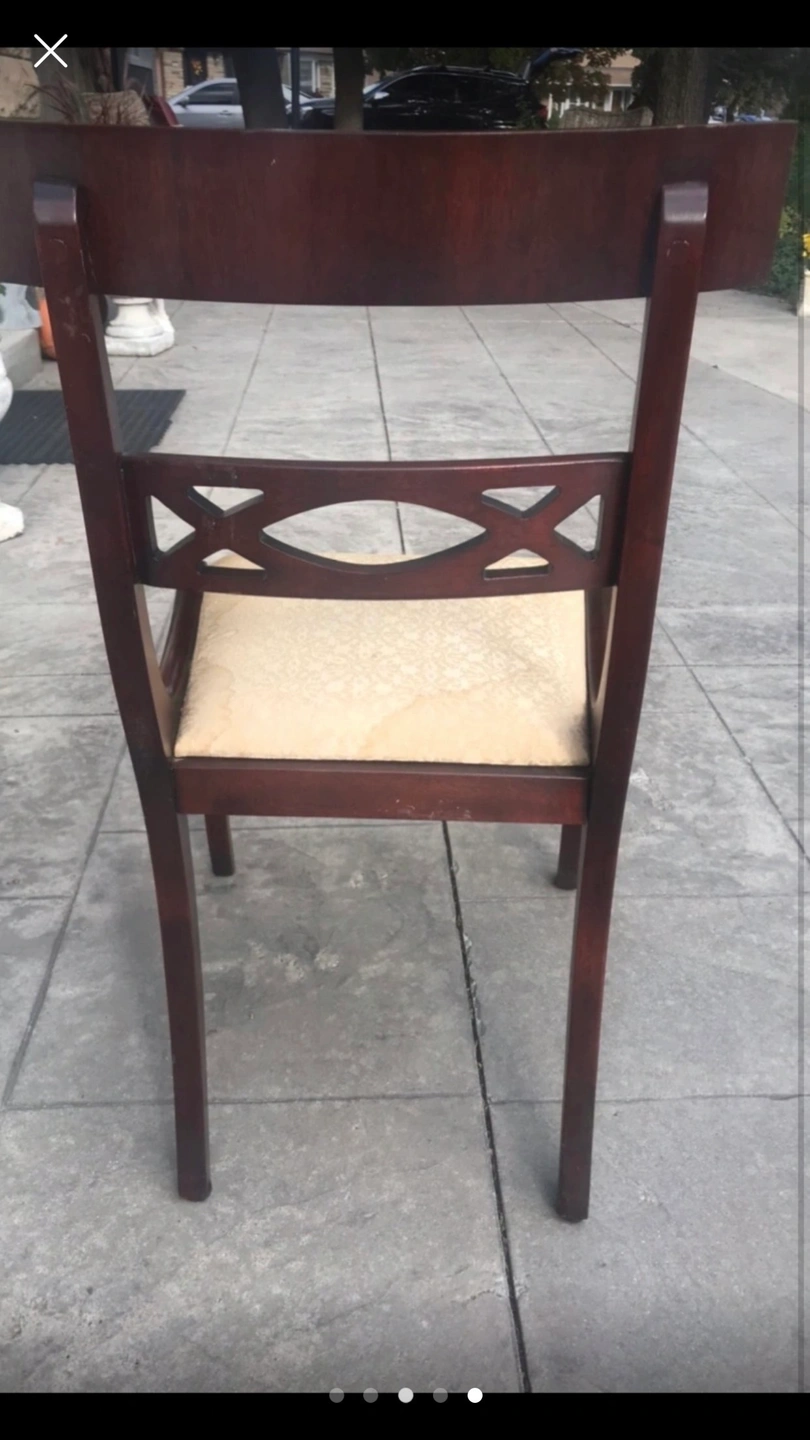Dining table with two leaves and six chairs. Seats are removable to update cushions as some staining. Table had minor water damage on edges.