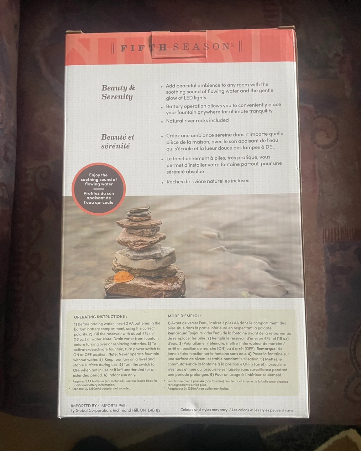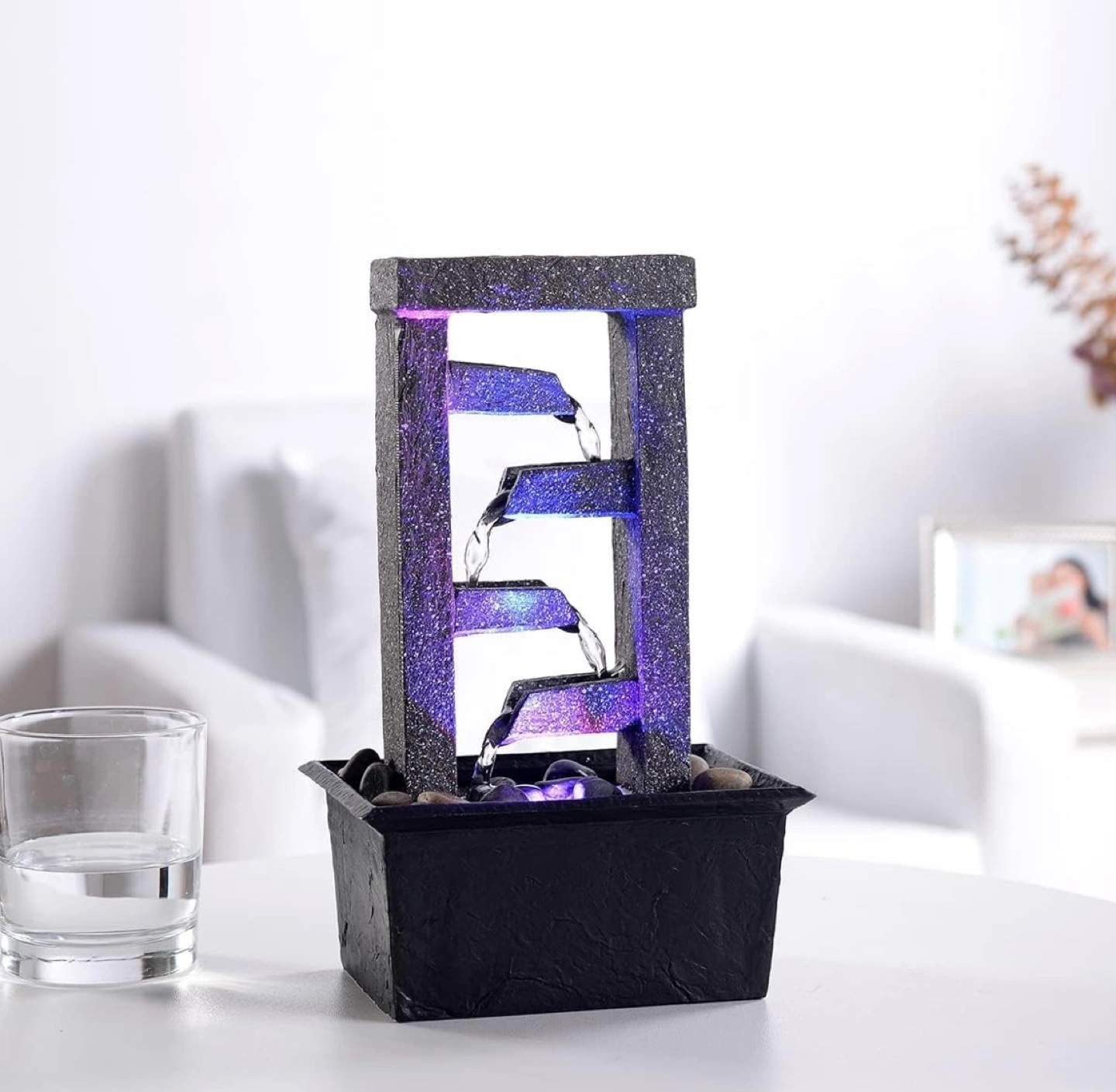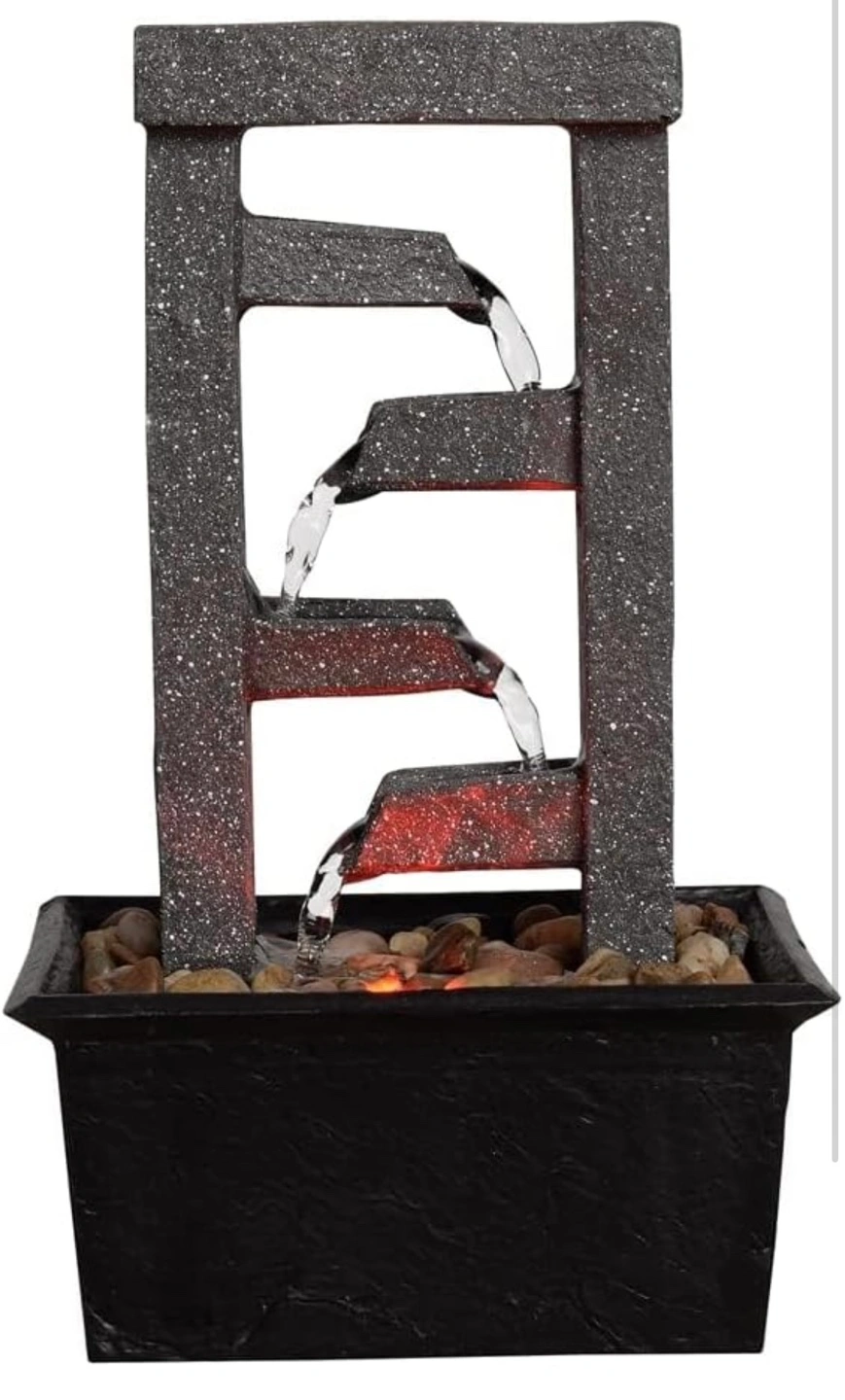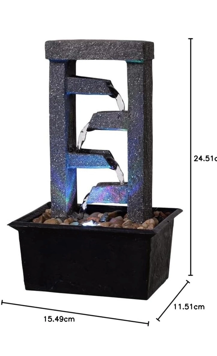 Add peaceful ambiance to any room with the gentle sound of flowing water and the convenient glow of LED lights. Battery operation allows you to conveniently place the fountain anywhere. Natural river rocks included.