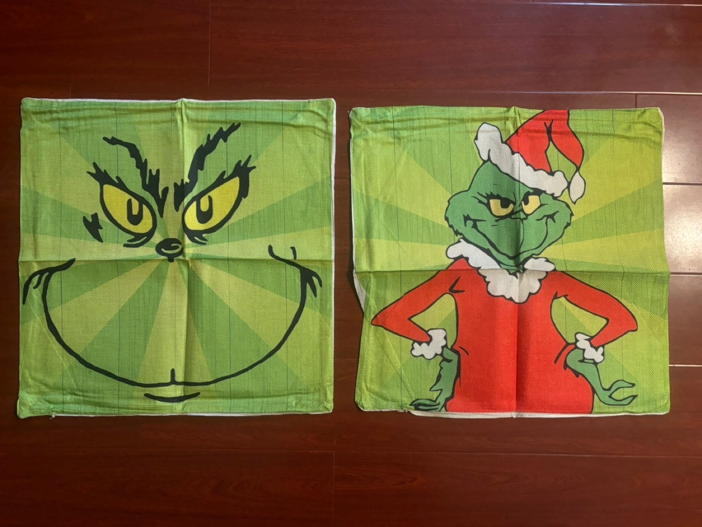 Two Grinch pillow covers. Green with red, white, and black accents. Grinch is depicted on both covers, one with his face and the other with his whole body. 18 x 18