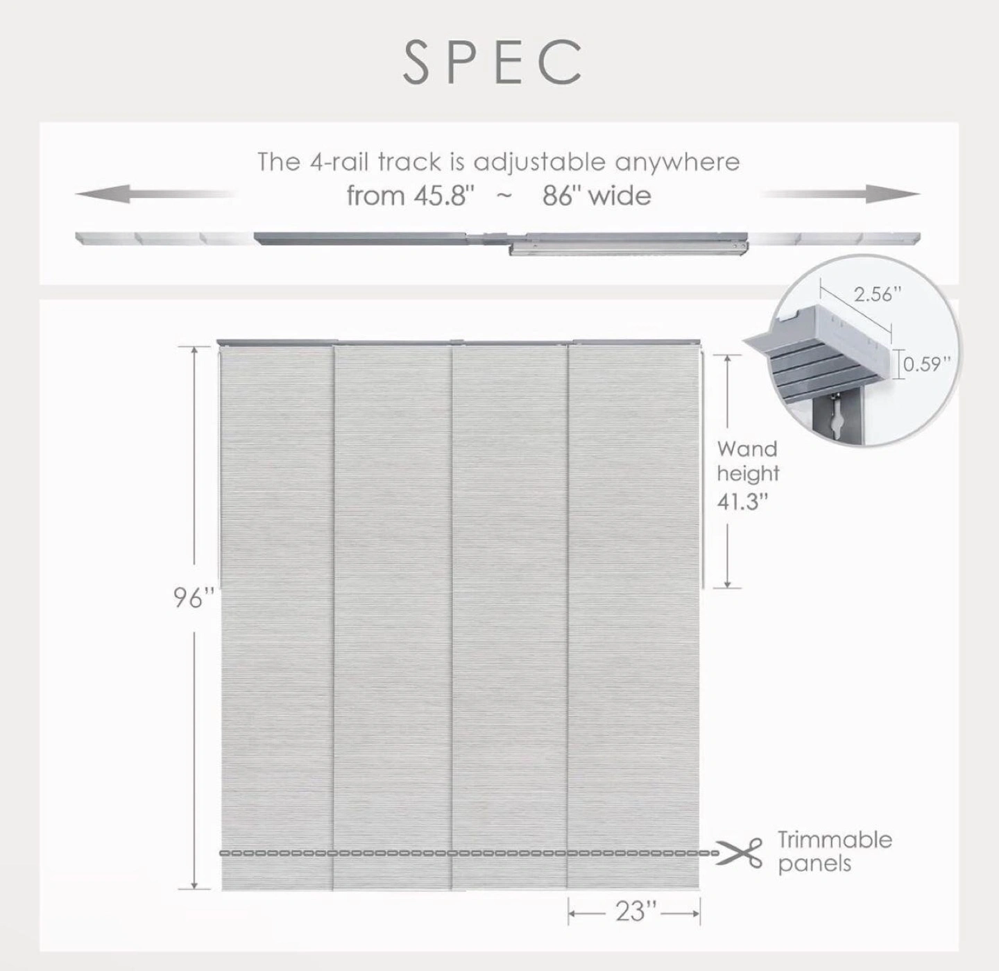 Natural woven fabric panels with a 4-rail track. Adjustable track fits openings from 45.8 inches to 86 inches wide. Wand height is 41.3 inches. Panels are trimmable. Ceiling or wall mount.