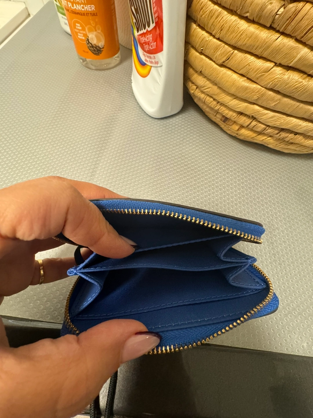 Small zip around wallet with floral print and gold zipper. Features multiple card slots and a bill compartment.
