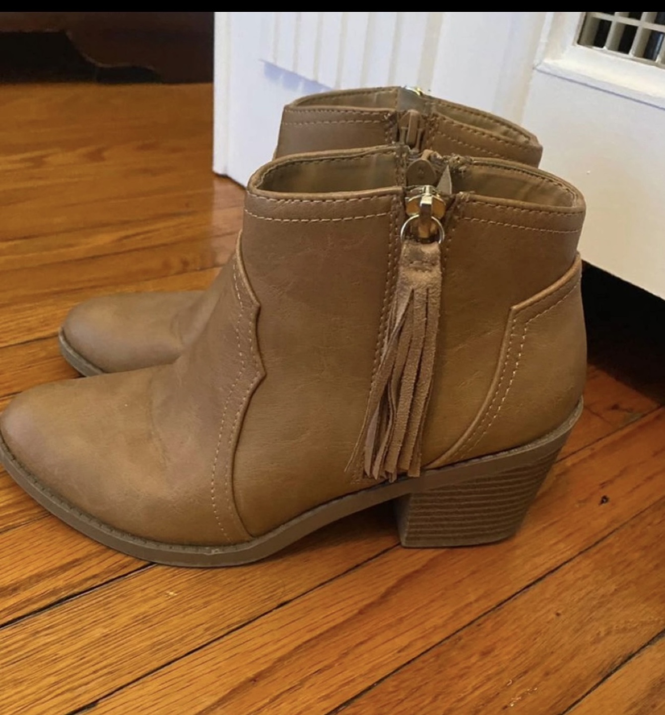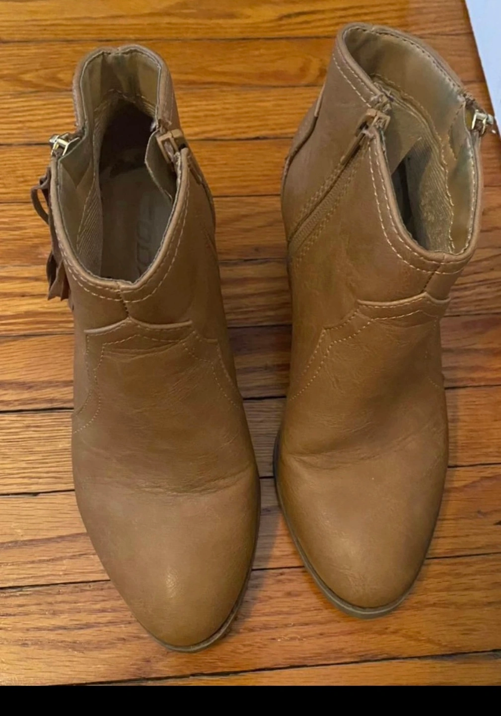 Tan ankle boots with a zipper closure. The boots have a low heel and a pointed toe. The boots have a tassel detail on the zipper. Like new. Size 5 1/2. It will fit also if your size 6. Cash only.Pick up at 1795 St.Clair West. Low ballers will not be answered my price is fixed. No Refunds /Exchange. If you see it posted on here it means it is still avallable, so please don't ask. Just tell me when would you like to pick up. I won't answer to "I'm interested in this or l'm interested in buying" if it's up, it's available. Feel free to also check my other listings! ***First come first serve.