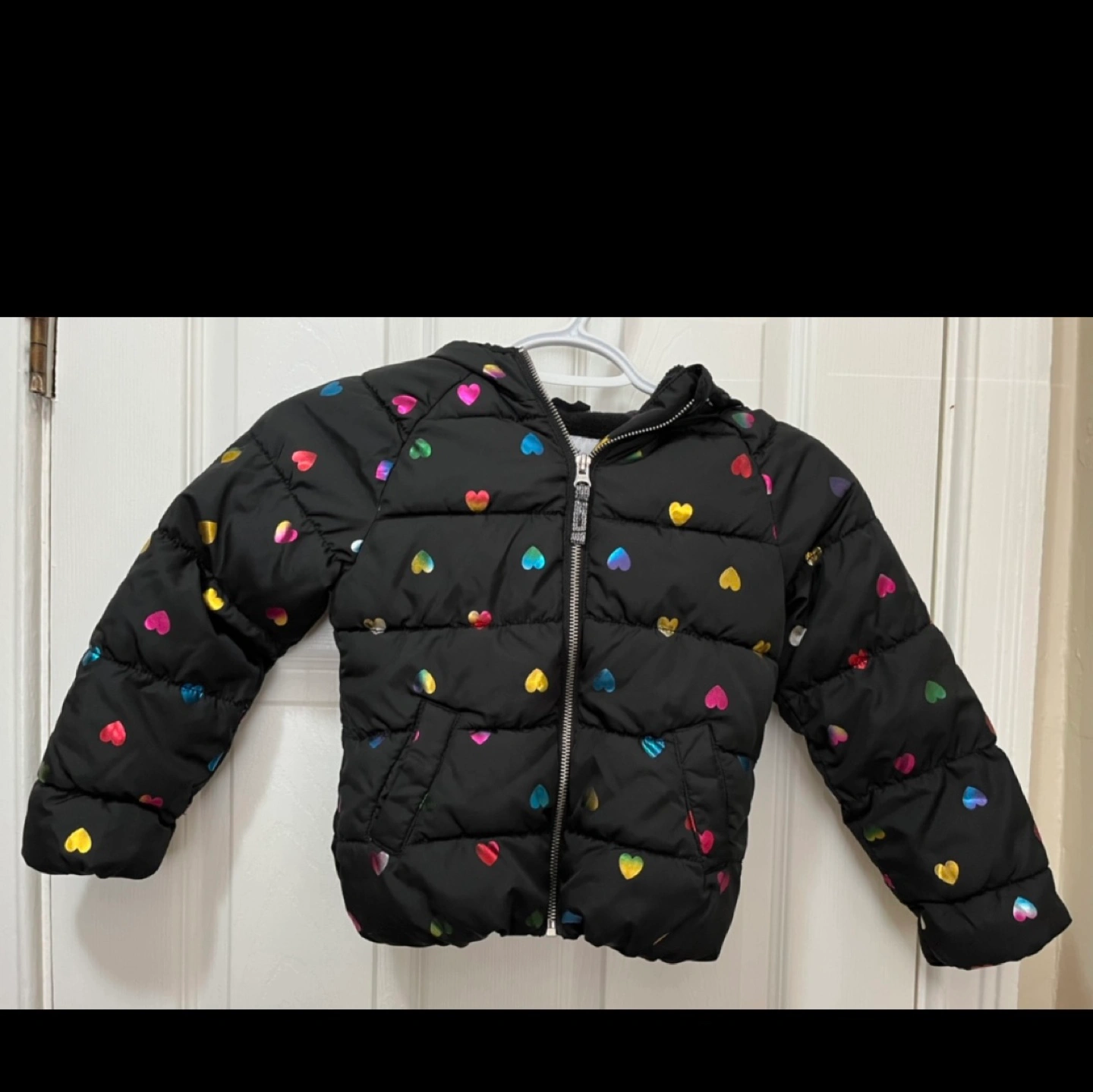 Black puffer jacket with rainbow heart print. Features a hood and zipper closure.